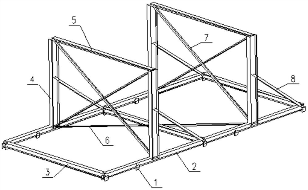 本实用新型涉及钢结构地面二次拼接技术,特别涉及一种可拆卸自平衡靠模。靠模为可拆卸结构,结构包括由两根底部纵梁和两根底部横梁组成的矩形底部框架结构,矩形底部框架上还设有多个矩形的立式框架结构;立式框架结构包括分设于两根底部纵梁上的两根立柱,两根立柱顶部通过柱顶横梁相连,立柱底部设于底部纵梁上;立式框架的对角间设有立柱间斜撑,立柱中部与底部纵梁间还设有立柱间侧向抛撑,相邻立式框架的位于异侧的立柱底端还通过底部斜撑相连;底部纵梁上还设有多个短柱。本装置构造简单、施工过程中安拆方便、材料选用灵活,占用施工场地小,提高工作效率。适用于大跨度分段、分片钢结构之间的地面二次拼接工作。