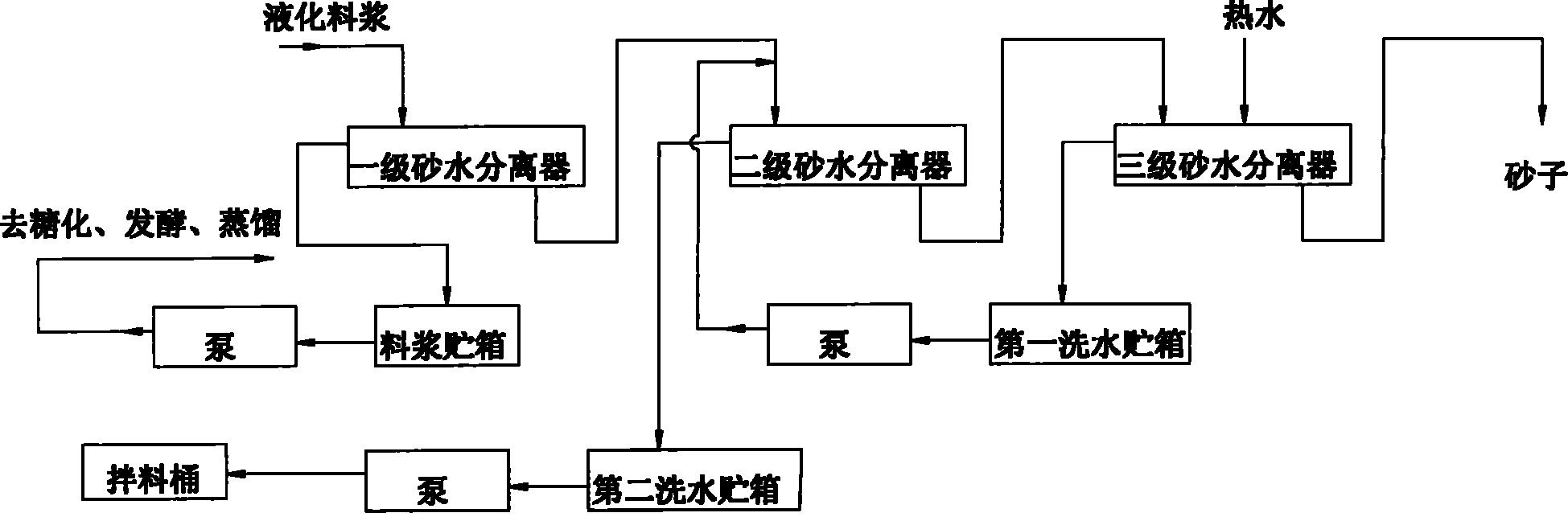 本发明涉及乙醇制备领域,公开了一种用薯类制备乙醇的方法。它基于乙醇制备装置,其特征在于,制备方法包括以下步骤:预处理;拌料;液化;除砂;生成乙醇。本发明将除砂步骤放置在液化之后,采用三级除砂工艺,工艺布置合理,除砂效果明显,乙醇收率高。