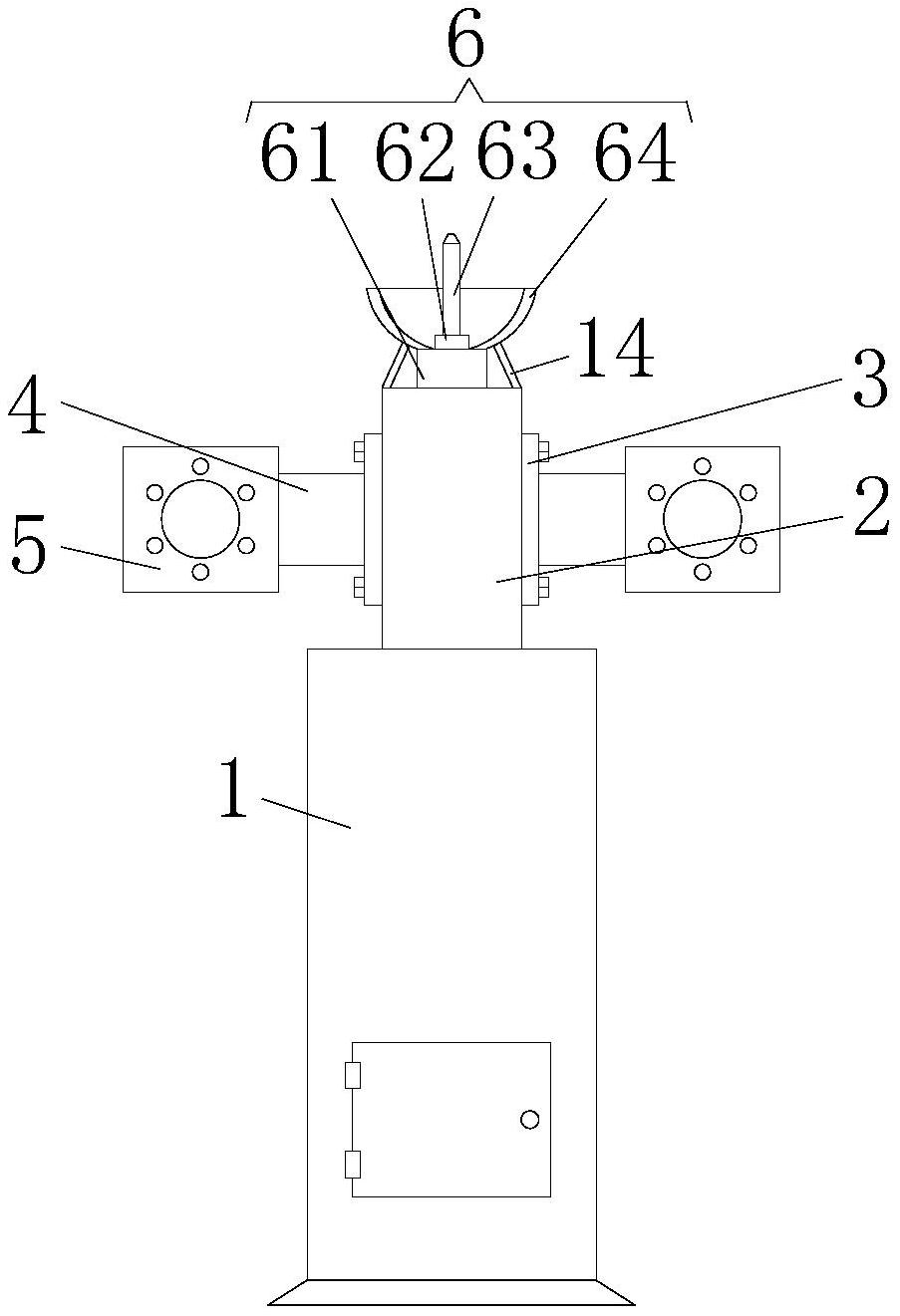 本实用新型公开了一种公共设施综合安全监控装置,包括壳体,所述壳体的顶部固定连接有支撑柱,所述支撑柱的两侧均固定连接有安装板,所述安装板的外侧固定连接有支撑杆,所述支撑杆的外侧固定连接有安全监控装置主体,所述支撑柱的顶部设置有防雷机构。本实用新型通过设置壳体、支撑柱、安装板、支撑杆、安全监控装置主体、防雷机构、隔板、通槽、外壳、防雷器、接地线、穿线孔、装配板和固定杆的相互,达到了防雷功能的优点,解决了现有的安全监控装置不具有防雷功能的问题,当雷雨天气中使用安全监控装置时,不会使安全监控装置被雷电击中,不会造成安全监控装置出现损坏,不影响其安全性能,方便人们使用。