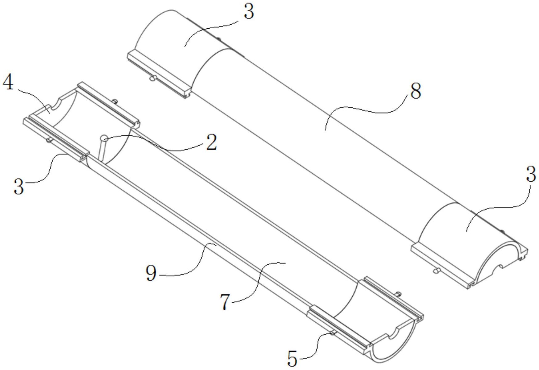 本实用新型提供一种预裂爆破切缝管装置,所述切缝管装置包括切缝管本体,切缝管本体包括上半壳和下半壳;上半壳和下半壳内分别为空腔结构,从而形成装药槽;上半壳和下半壳能够扣合在一起,从而形成密封的切缝管本体;切缝管本体的两端分别设有圆孔;下半壳内位于装药槽的一侧还设有固定柱;本实用新型提供的预裂爆破切缝管装置,能够方便安装导爆索和药卷,从而进行爆破测试;该爆破切缝管装置,结构设计合理、方便组装,且方便调节,能够方便进行爆破测试,提高测试精度。