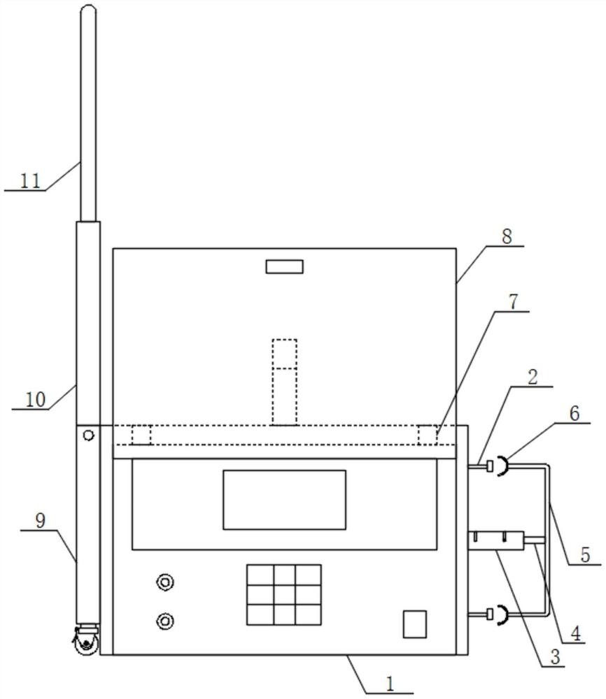 本实用新型公开了一种复合管管壁修复装置,包括装置本体,所述装置本体侧面靠近四角的位置均设有绕线杆,所述装置本体侧面的中间位置设有固定筒,所述固定筒上设有拉杆,所述拉杆的端部设有连接杆,所述连接杆的两端上均设有限位半环,所述固定筒的内部设有移动块与弹簧,所述固定筒上设有两个定位杆,所述装置本体的另一侧面上设有两个稳固杆,所述稳固杆的顶端设有转动杆,转动杆的顶端设有握杆;装置本体上连接有较长的电焊管线,电焊管线环绕绕线杆后收卷起来,限位半环卡住电焊管线及电焊管线被限位固定,便于收卷电焊管线,装置本体倾斜放置及稳固杆上的滚轮着地,稳固杆上的滚轮与地面之间的摩擦力小,可省事省力的移动装置本体。