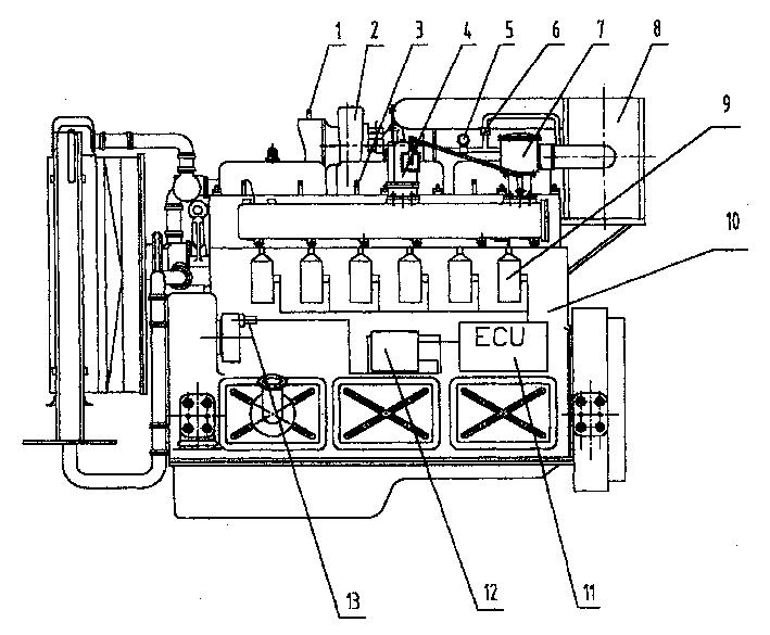 本实用新型公开了一种燃用可燃气体的电控增压及增压中冷气体发动机,包括增压及增压中冷气体发动机本体,发动机本体上装有混合器和点火单元,其特征是:发动机本体上增加了电控自动控制装置,电控自动控制装置包括混合器连接的空燃比控制阀,及点火单元连接的空燃比控制器。其有益效果为:在不改变原机安装尺寸和其他零部件的情况下,可根据发动机不同运行工况,自动调整混合气浓度及流量、点火时刻等参数。提高了气体发动机对不同工况的适应性,达到了良好的动力性与经济性及可靠性。