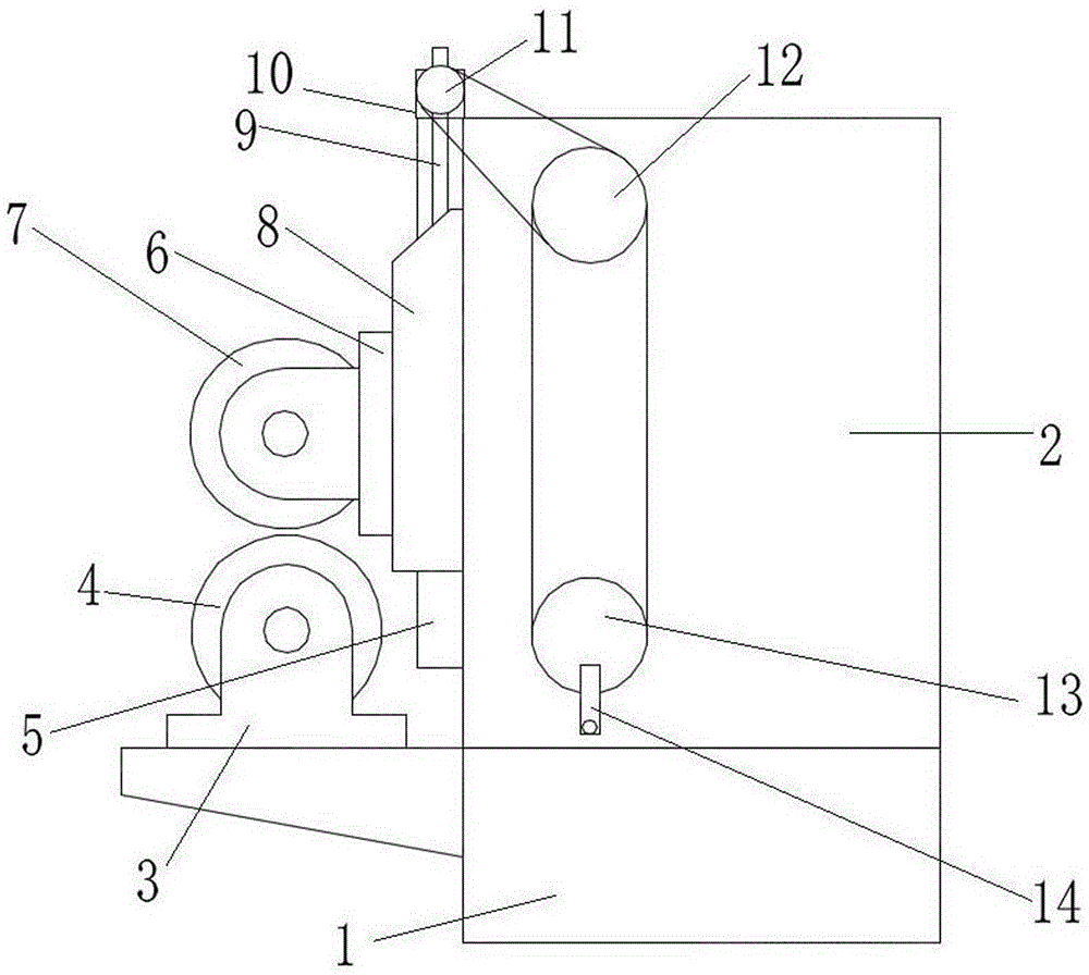一种退火炉炉口密封辊,包括:安装于底座上的退火炉、通过带座轴承Ⅰ水平转动安装于底座上且位于退火炉炉口前端的下辊、竖直设置于退火炉前端的导轨、滑动安装于导轨上的滑块、通过带座轴承Ⅱ水平转动安装于滑块上且位于下辊正上方的上辊。滑块驱动装置驱动滑块上下运动,从而调整上辊和下辊之间的间距,从而使上辊和下辊的辊面与进入退火炉的钢板的上下表面紧密接触,从而起到密封作用,不但密封效果优良,同时不会有杂质附着在钢板表面,提高了产品质量。