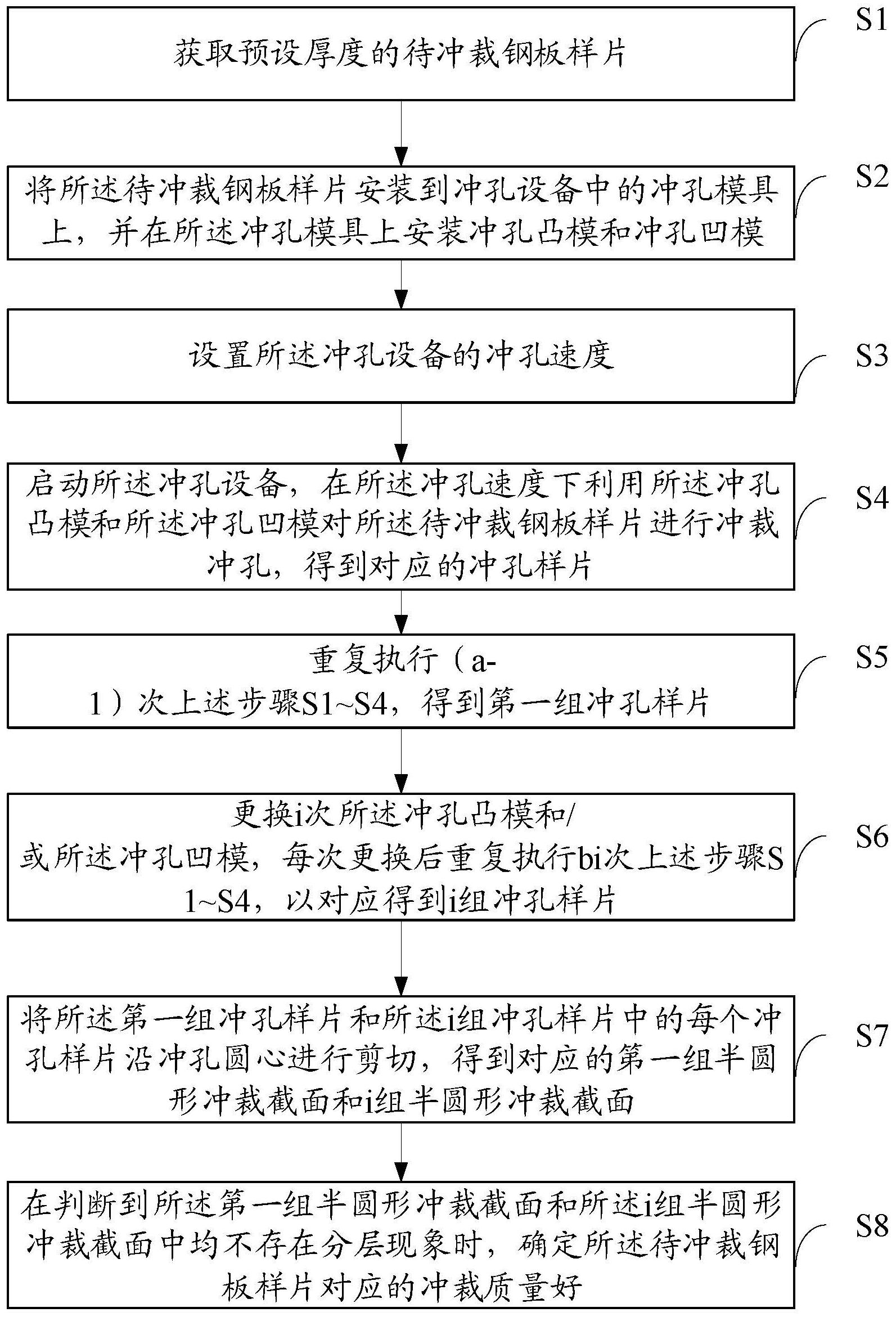 本发明公开了一种钢板冲裁质量判定方法及终端设备,所述方法包括:S1获取预设厚度的待冲裁钢板样片;S2将待冲裁钢板样片安装到冲孔模具上并安装冲孔凸模和冲孔凹模;S3设置冲孔速度;S4启动冲孔设备,对待冲裁钢板样片进行冲孔得到冲孔样片;S5重复执行上述S1~S4得到第一组冲孔样片;S6更换i次所述冲孔凸模和/或所述冲孔凹模,每次更换后重复执行上述S1~S4得到i组冲孔样片;S7将多组冲孔样片中的每个冲孔样片沿冲孔圆心进行剪切得到多组半圆形冲裁截面;S8在判断到多组所述半圆形冲裁截面中不存在分层现象时,确定所述待冲裁钢板样片对应的冲裁质量好。采用本发明,能实现冲裁质量判定的便捷性和高效性。