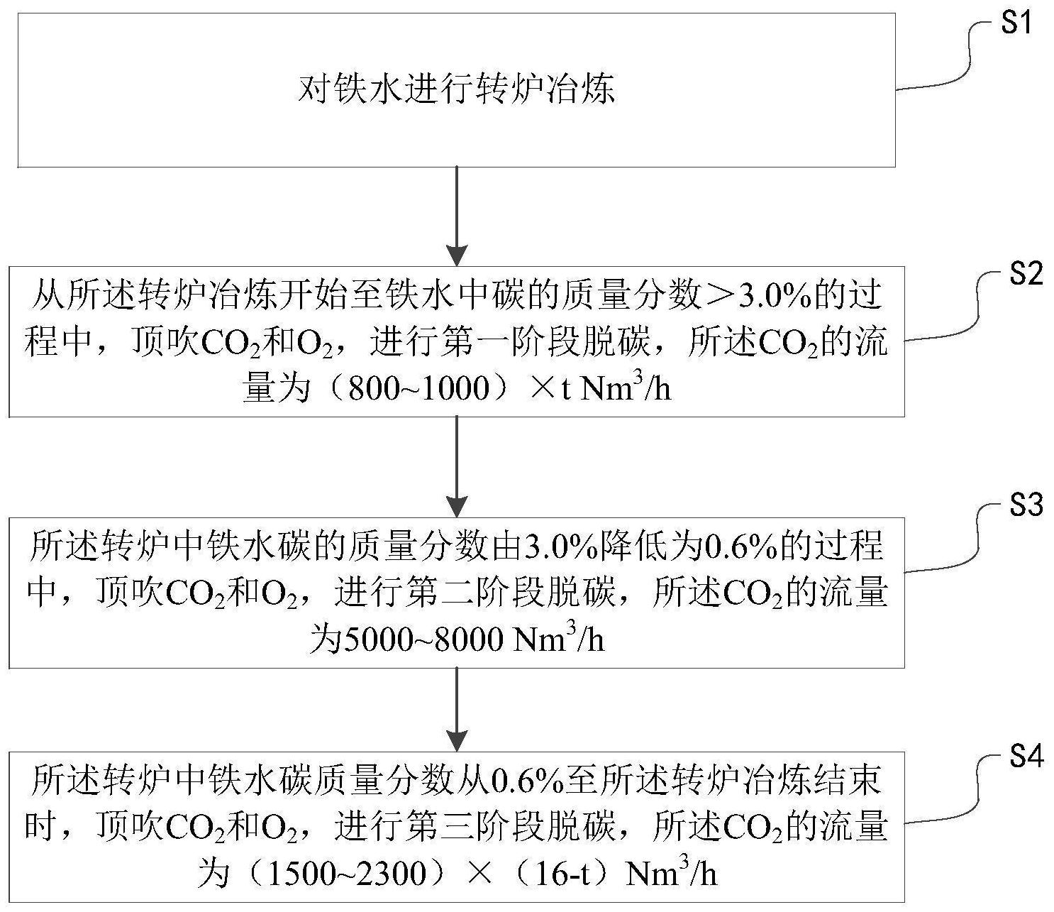 本发明公开了一种转炉高效利用二氧化碳的方法,该方法包括:S1,对铁水进行转炉冶炼;S2,从所述转炉冶炼开始至铁水中碳的质量分数>3.0%的过程中,顶吹CO2和O2,进行第一阶段脱碳,所述CO2的流量为(800~1000)×t Nm3/h;S3,所述转炉中铁水碳的质量分数由3.0%降低为0.6%的过程中,顶吹CO2和O2,进行第二阶段脱碳,所述CO2的流量为5000~8000Nm3/h;S4,所述转炉中铁水碳质量分数从0.6%至所述转炉冶炼结束时,顶吹CO2和O2,进行第三阶段脱碳,所述CO2的流量为(1500~2300)×(16‑t)Nm3/h。本发明通过三阶段控制顶吹二氧化碳的流量,第一阶段脱碳过程中线性增加,然后处于较高的顶吹流量,第三阶段脱碳过程中线性降低,以与熔池内的反应过程向匹配,提高了二氧化碳的利用效率。