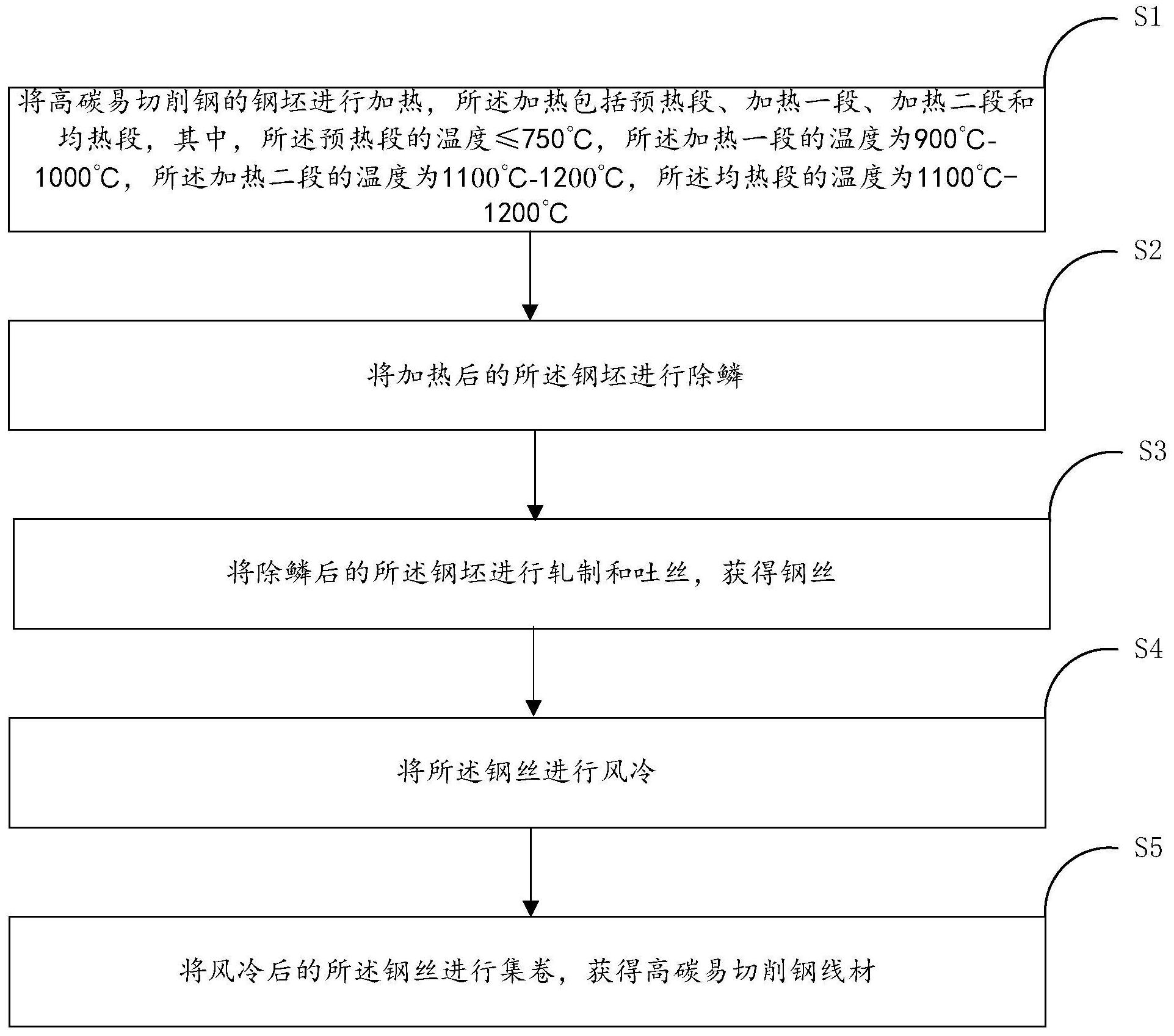 本发明特别涉及一种高碳易切削钢线材的轧制方法,属于钢材轧制技术领域,方法包括:将高碳易切削钢的钢坯进行加热,所述加热包括预热段、加热一段、加热二段和均热段,其中,所述预热段的温度≤750℃,所述加热一段的温度为900℃‑1000℃,所述加热二段的温度为1100℃‑1200℃,所述均热段的温度为1100℃‑1200℃;将加热后的所述钢坯进行除鳞;将除鳞后的所述钢坯进行轧制和吐丝,获得钢丝;将所述钢丝进行风冷;将风冷后的所述钢丝进行集卷,获得高碳易切削钢线材;通过设定较高的加热一段温度和加热二段温度,可快速将铸坯温度提高至能进行碳扩散的温度,减少铸坯因碳偏析造成的局部网状碳化物现象。