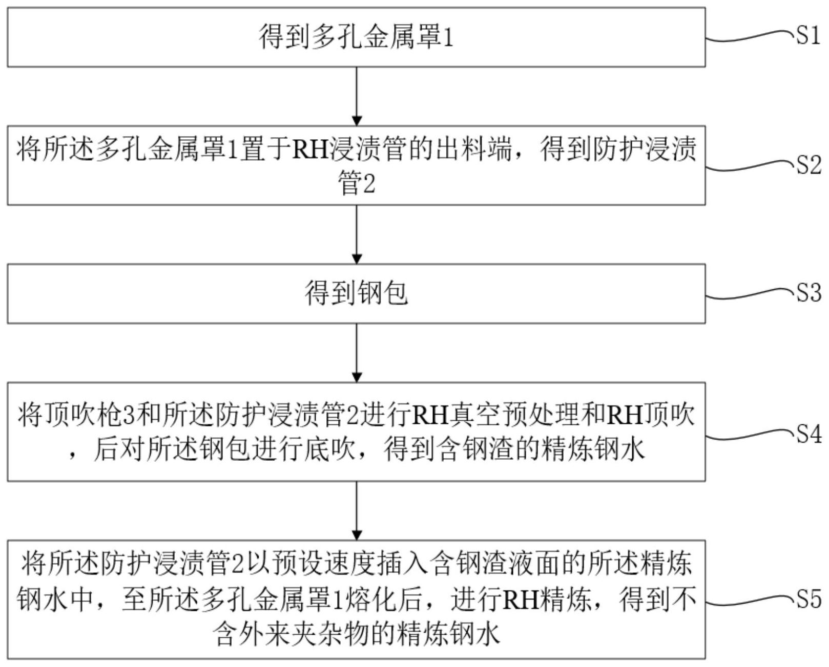 本申请涉及冶炼技术领域,尤其涉及一种控制超低碳钢中大型夹杂物的方法及其应用;所述方法包括:得到多孔金属罩;将多孔金属罩置于RH浸渍管的出料端,得到防护浸渍管;得到钢包;将顶吹枪和防护浸渍管进行RH真空预处理和RH顶吹,后对钢包进行底吹,得到含钢渣的精炼钢水;将防护浸渍管以预设速度插入含钢渣液面的精炼钢水中,至多孔金属罩熔化后,进行RH精炼,得到不含外来夹杂物的精炼钢水;所述应用包括:将所述方法用于对210t~300t钢包的RH精炼过程中;利用多孔金属罩套设在RH浸渍管的出料端,并与钢包底吹的钢液运动力学控制过程相匹配,从而能有效的抵挡炉渣进入浸渍管中,实现RH过程的进入浸渍管的熔渣量的有效降低。