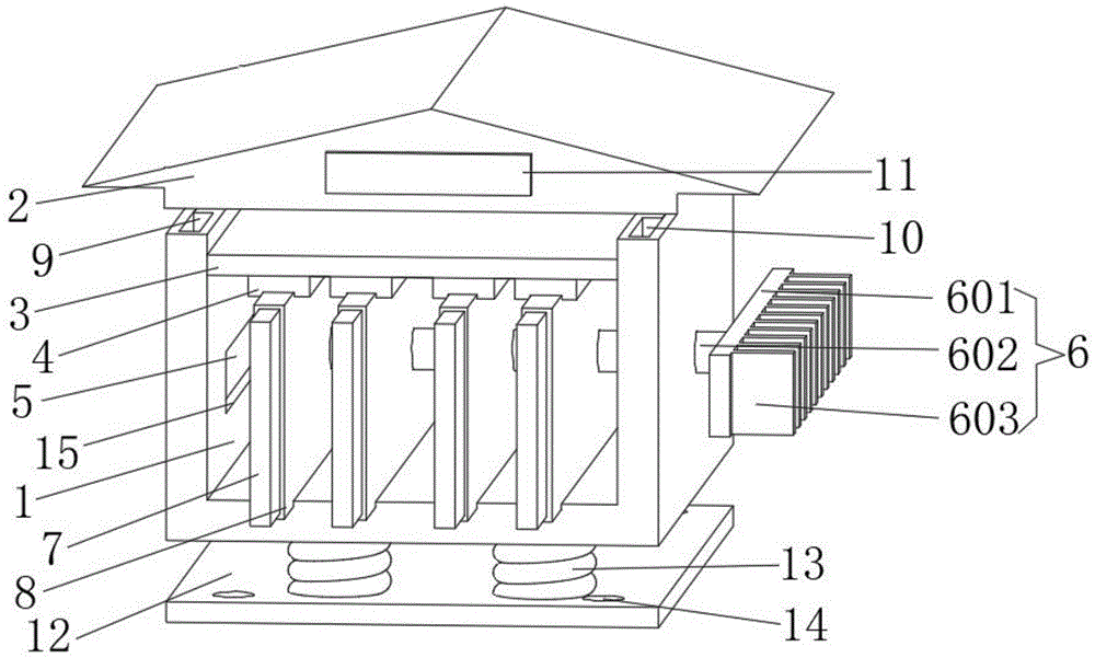 本实用新型公开了一种高防护高强度防渗透密集型母线槽,包括母线槽体;母线槽体:所述母线槽体为“L”形槽,所述母线槽体的上表面两侧均设有滑槽,所述滑槽内均滑动连接有滑块,所述滑块的另一端固定连接有导水盖,所述母线槽体的内部设有吸水棉,所述吸水棉的两侧分别与母线槽体的内侧面固定连接,所述吸水棉的下表面均匀设有四个固定槽,所述母线槽体的上表面均匀设有四个导电板,所述导电板与固定槽位置大小对应,所述导电板的外表面套接有绝缘层,本高防护高强度防渗透密集型母线槽,具有较好的密封性,且能够避免水渗透入母线槽体内,对导电板造成影响,且能够有效的对母线槽体内进行防潮和散热处理。