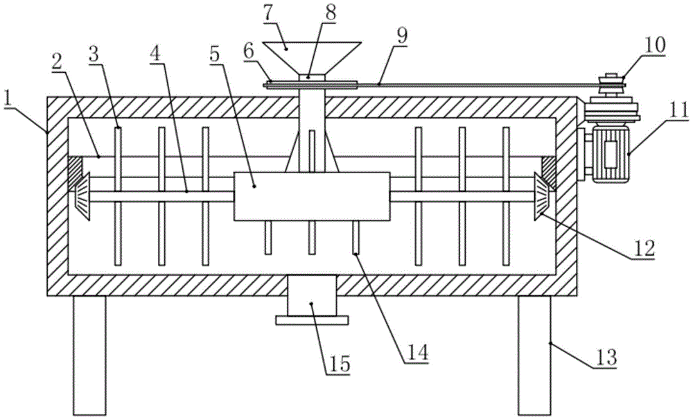 本实用新型涉及涂料加工领域,具体是一种涂料加工用多级混合装置,包括机体,所述机体的顶部中间转动安装有导料管,机体的外侧设有用于驱动导料管旋转的驱动机构,导料管的下端安装固定有混合座,混合座的外侧周向分布安装有多根转动轴,转动轴上安装有若干第一搅拌杆,转动轴的外端安装固定有锥齿轮,机体的腔壁上还固定设有与锥齿轮啮合连接的齿圈,混合座的内腔为初混腔,且初混腔内于转动轴的端部安装固定有第二搅拌杆,混合座的底部还安装有若干与初混腔连通的搅拌管。本实用新型结构设置合理,能进行较好效果和效率的多级混合,提升涂料的加工质量。