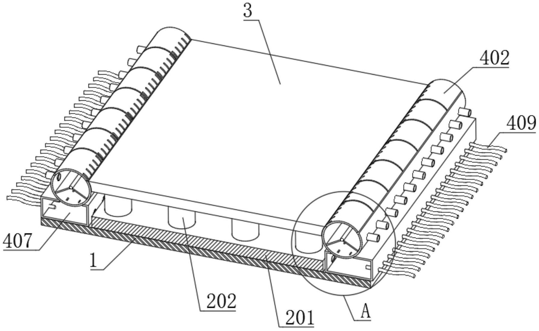 本实用新型涉及建筑施工技术领域,具体为一种高承载环保地坪,包括地基,所述地基的顶部设置有支撑结构,所述支撑结构的顶部设置有路面,所述路面的左右两侧均设置有排水结构,所述排水结构包括筛分管、顶盖、第一隔板、第二隔板、排水管、漏水孔、蓄水箱、进水管和引水绳,所述筛分管的顶部活动连接有顶盖。本实用新型的优点在于:通过设置排水结构,达到了既可以有效储存利用雨水的目的,避免出现排水效果不佳的缺点,同时S形漏水孔既可以使雨水进入蓄水箱,又可以防止蓄水箱内部的气味进入筛分管,通过设置支撑结构,达到了可以便于工作人员快速铺设路面的目的,同时又可以使路面具有较高的承载能力,结构简单,操作方便。