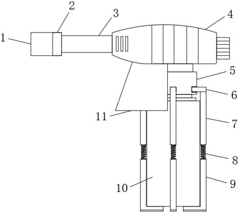 本实用新型属于无机涂料技术领域,且公开了一种无机涂料耐火性能测试设备,包括火焰喷射枪体,所述火焰喷射枪体的一侧安装有喷射管,且火焰喷射枪体的底部固定有安装座,所述火焰喷射枪体的底部靠近安装座的一侧安装有按钮,所述安装座的底部连接有燃料罐,所述燃料罐的外壁安装有四个第二连接板,四个所述第二连接板的顶端均固定有弹簧,本实用新型通过第二连接板、第一连接板、限位块、限位槽和弹簧的配合,可将燃料罐抵紧在安装座上,从而使燃料罐稳定连接,防止了燃料罐发生活动,避免了燃剂泄漏,提高了安全性,通过护板可隔离火焰高温的灼烧,从而对使用者的手部进行保护,避免烧伤皮肤,提高了使用时的舒适度。