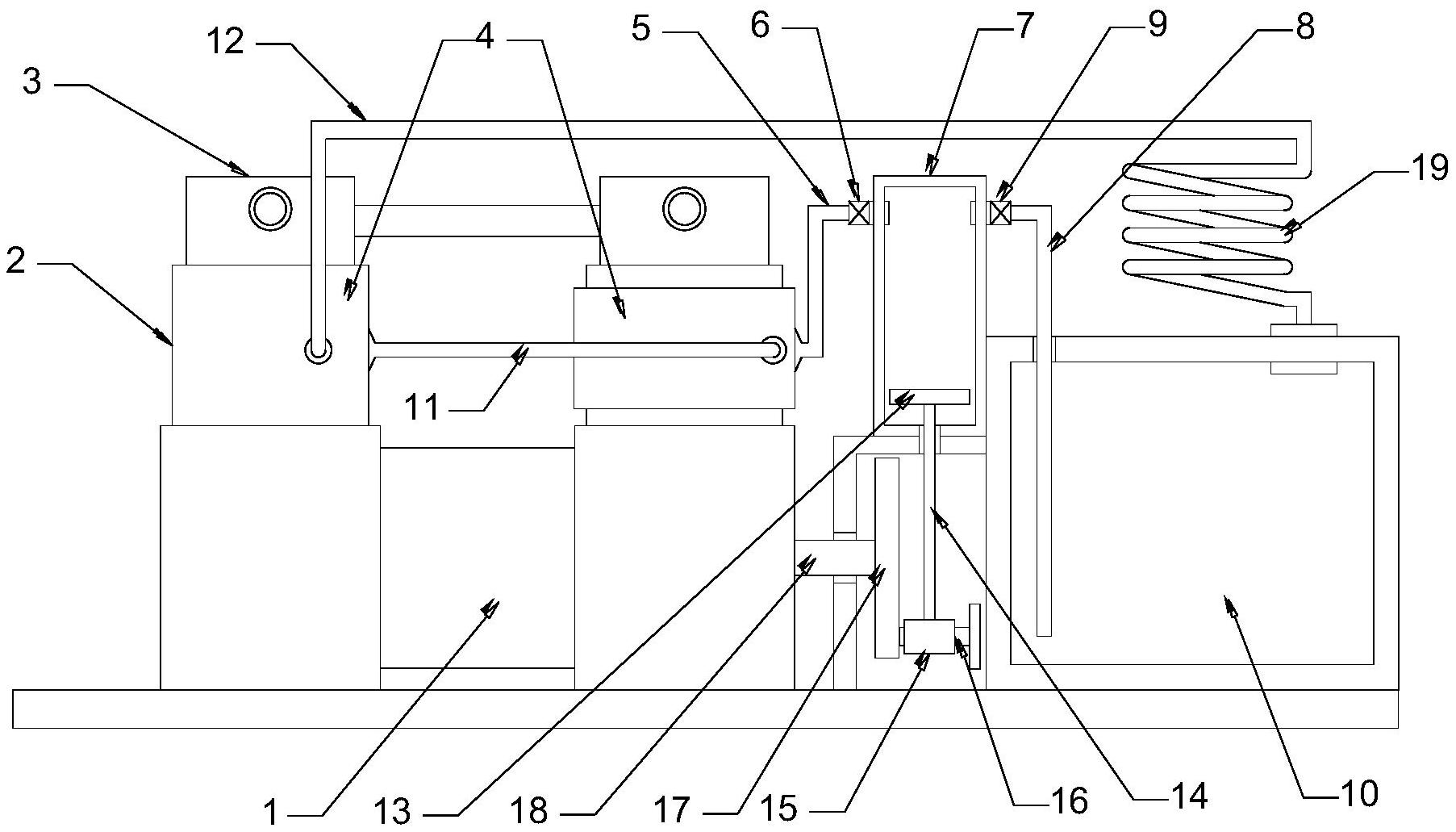 本实用新型公开了一种玻璃胶生产用无油空气压缩机,包括电机和活塞气缸;所述电机两侧设有活塞气缸,活塞气缸外侧套设有冷却夹套,冷却夹套连通有冷却液循环机构。本实用新型通过设有冷却夹套和冷却液循环机构,实现对气缸活塞的液冷冷却,相比气冷方式,冷却效果明显,适合工厂连续作业的场景;通过设有包括连杆、偏心盘、偏心柱的往复驱动机构,实现与电机输出轴的联动,结构紧凑,无需单独设置动力设备,方便实用。