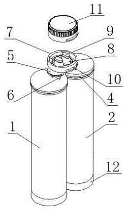 本实用新型公开了一种双管式美缝剂存储装置,包括第一管体和第二管体;第一管体和第二管体的外侧壁之间通过一个或一个以上的连接块连接,第一管体和第二管体顶端都设有管盖,两个管盖上都设有出胶口;第一管体和第二管体上方设有盖拖,盖拖底部两侧通过连接片连接两个管盖顶部;所述盖拖顶部中央连接定位环,两个管盖的出胶口各连接一个竖直向上的出胶管,两个出胶管顶端位于定位环内或延伸至定位环上方;两个出胶管底端分别连通第一管体和第二管体内部,第一管体和第二管体顶端设有密封盖;该双管式美缝剂存储装置,将固化剂和颜料分别存储在两个固定连接的管体内,方便携带运输。