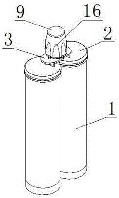 本实用新型公开了一种瓷砖双管美缝器,包括两个左右并列连接的管体;两个管体顶端设有管口,两个管口上盖有管口座,管口座由圆形底座、凸台、套管和竖板组成,两个圆形底座安装在两个管体顶端,圆形底座顶面中央连接椭圆形的凸台,凸台顶面中央连接套管,套管内部中央连接竖板,竖板顶端延伸至套管上方,竖板底端连接凸台;圆形底座内部、凸台内部都设有与两个管体的管口相连通的出液孔,竖板与套管内壁之间形成两个与出液孔相连通的出液通道;所述套管的外部连接旋帽,套管和旋帽内安装堵头;该双管美缝器通过改良管口结构,密封性更强,定位凸块、定位凸片以及挡片底端的卡齿都能起到定位作用。