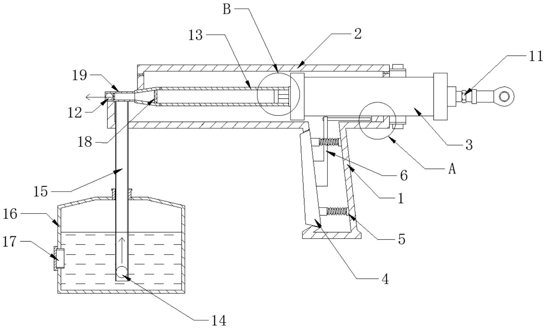 本实用新型公开了一种可移动式内墙涂料喷枪,涉及涂料喷枪技术领域,装置主体顶部设有顶盖,装置主体底部设有扳机,扳机内侧设有弹簧柱,且弹簧柱的右侧连接装置主体,并且扳机的内侧设有连接器,且连接器顶部设有传输轴,装置主体顶部与气缸进行连接,并且喷嘴内部设有第一单向阀,且滤嘴底部设有橡胶管,橡胶管底部与储料罐进行连接,且橡胶管底部设有第二单向阀。通过气缸、液压杆和喷气管等装置,在使用者按下扳机后,便可将储料罐中的涂料喷涂在墙上,且可以通过气缸来不断地往喷气管内灌入压力,使得涂料可以喷涂较远的内墙,同时也可使使用者在使用时可以方便的移动,大大提高了效率。