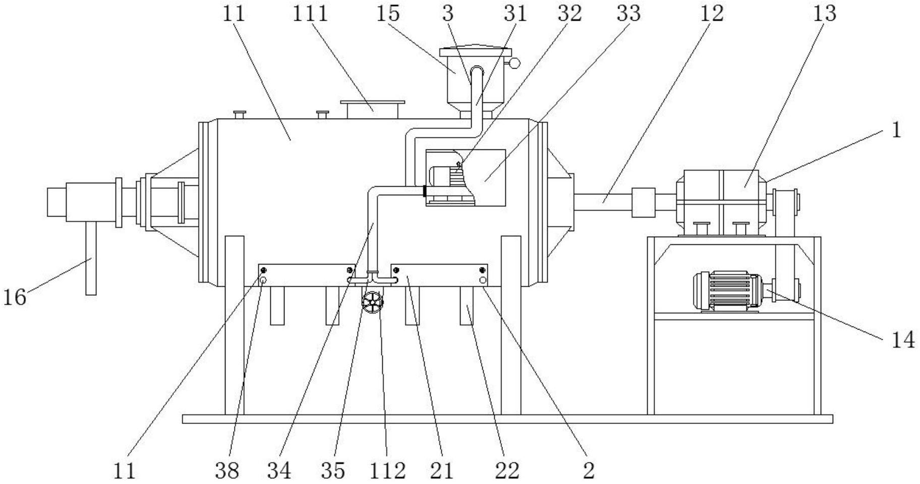 本实用新型涉及干燥装置技术领域,且公开了一种腻子粉生产用的防潮装置,包括干燥装置和搅拌组件,所述干燥装置包括干燥箱、轴体一和减速机,所述干燥箱的内部设置有所述轴体一,所述轴体一的外侧壁设置有多个搅拌叶一,所述轴体一贯穿所述干燥箱的外侧壁与所述减速机连接,所述减速机的另一端通过皮带与电机的输出轴传动连接;该腻子粉生产用的防潮装置,通过在干燥箱的底部设置一个搅拌组件,使干燥箱底部不好搅动的堆积腻子粉送到上面,使底部的腻子粉也能充分搅拌、受热均匀,在腻子粉的水分升温蒸发后,通过管道输送到底部的搅拌组件当中,对搅拌组件加热,使腻子粉的干燥效率增加,热源的消耗减少。
