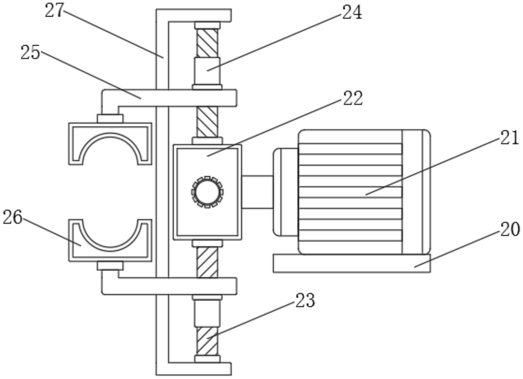 本实用新型涉及腻子粉生产技术领域,且公开了一种腻子粉生产用的干燥装置,包括干燥机组件,所述干燥机组件包括机箱,所述机箱的外侧壁安装有热控箱,所述机箱的顶端一侧设有进料斗,所述机箱的顶端另一侧焊接有排湿管,所述机箱的底部安装有出料管,所述出料管的外侧壁设有卸料阀,所述机箱的底部设有开合组件;通过设置的两个滚珠丝杆转动带动两个滚珠螺母同时向内滑动,使两个夹块将包装袋口夹紧在出料管的外侧壁上,达到了自动开合夹具的目的,避免了在装包完成后,工作人员需要将装满腻子粉的包装袋向上提,脱离按压装置才可取走包装袋,减轻了工作人员的劳动力度,方便工作人员将装好腻子粉的包装袋取走,从而提高了搅拌干燥机的实用性。
