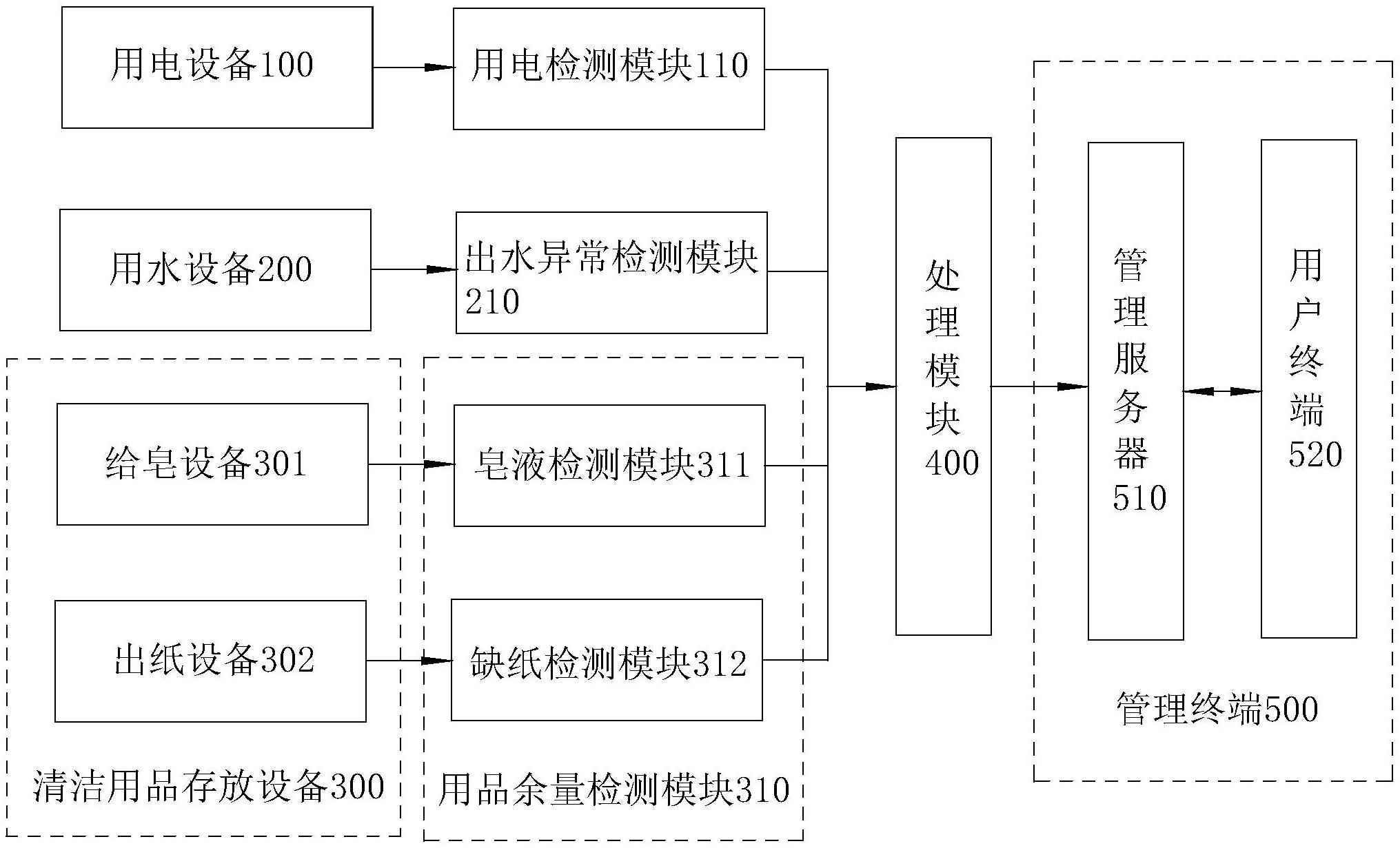 一种厕所故障检测系统,包括厕所本体、用电检测模块、出水异常检测模块、用品余量检测模块、处理模块以及管理终端。厕所本体中设有用电设备、用水设备以及清洁用品存放设备,用电检测模块与用电设备连接以检测用电情况,出水异常检测模块与用水设备连接以检测出水异常情况,用品余量检测模块与清洁用品存放设备连接以检测用品余量情况。处理模块分别与用电检测模块、出水异常检测模块和用品余量检测模块连接以根据用电情况、出水异常情况和用品余量情况确定故障信息,而管理终端与处理模块连接以获取故障信息,实现了自动检测并上报厕所设备用电异常、用水异常以及清洁用品余量不足等故障,不再依靠人为检查和通知,提升了故障检测的及时性。
