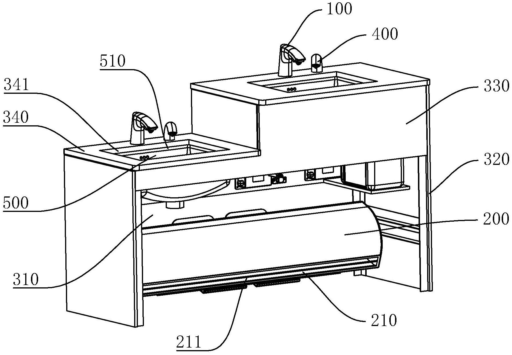 本实用新型公开了一种洗手台,包括:台体、设置在台体上的出水装置、用于风干地面的出风装置、用于感应使用者使用所述出水装置的状态的感应模块和控制模块,控制模块的输入端与感应模块电连接,控制模块的输出端分别与出水装置和出风装置电连接,感应模块感应到使用者使用出水装置时,感应模块将感应信号发送到控制模块,控制模块控制出水装置出水,并且同时控制出风装置运行,使出风装置向地面吹风,从而能够及时、自动地风干地面。