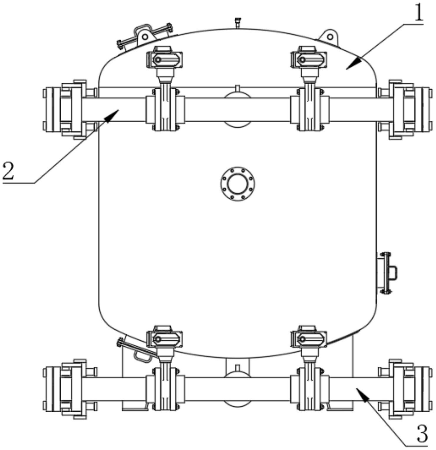 本实用新型公开了硅藻土过滤器的反冲装置,包括反冲罐本体,所述反冲罐本体上设有出气管和出水管,所述出气管和出水管的一端均固定连接有第一安装连接环,所述第一安装连接环的一侧设有第二安装连接环,所述第二安装连接环远离第一安装连接环的一侧设有两个第一限位板,所述第一限位板靠近第二安装连接环的一侧固定连接有插板,所述插板的一端分别贯穿第二安装连接环和第一安装连接环,所述插板上开设有定位孔,所述出气管和出水管上均套设有固定环,所述固定环的顶端和底端均设有弧形板。本实用新型所述的硅藻土过滤器的反冲装置,属于硅藻土过滤器技术领域,可以简单便捷的完成出气管和出水管与外部连接管的安装,操作步骤简单便捷。