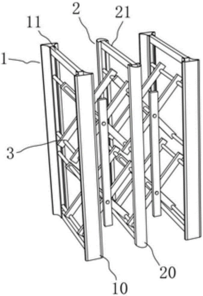 本实用新型公开了一种电动伸缩门门排结构,包括主框架、副框架和交叉连杆,主框架包括主框门柱和主框门梁,副框架包括副框门柱和副框门梁,其主框门柱包括主框门梁槽、弧面凹壁、外端平壁、侧平壁、内端平壁、槽侧壁和主框门柱腔,副框门柱包括副框门梁槽、弧面凸壁、拼接平壁、第一连接平壁、第二连接平壁、第三连接平壁和副框门柱腔,副框门柱的弧面凸壁与主框门柱的弧面凹壁匹配且弧面凸壁能够隐藏拼接在两侧主框门柱的弧面凹壁内,副框门柱的拼接平壁与主框门柱的槽侧壁贴齐,两侧主框门柱的侧平壁贴齐,具有门排在收缩时其副框架能够隐藏拼接在两侧主框架内、副框架和主框架收缩拼接紧凑、门排在完全收缩后整体占地空间更小的特点。