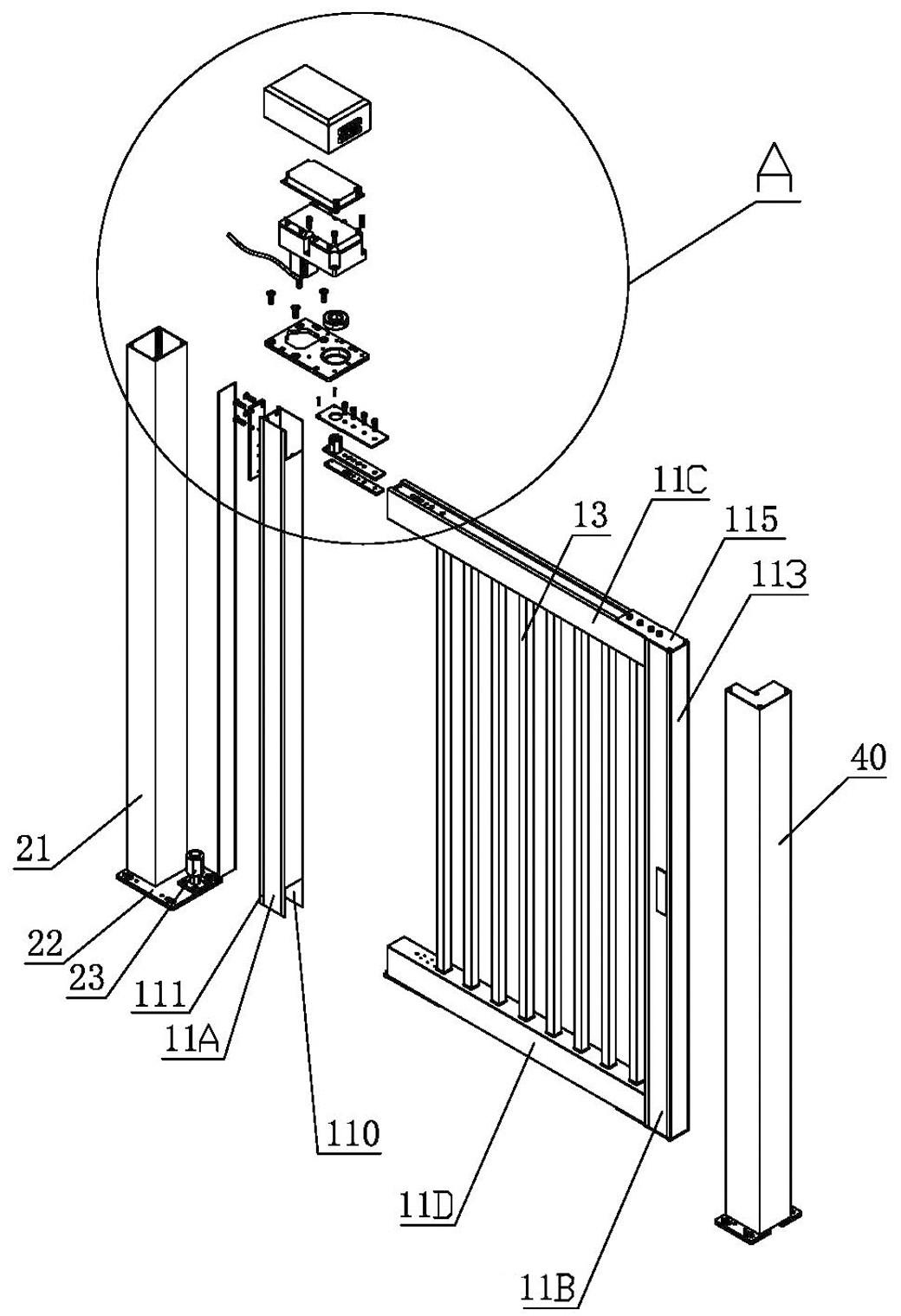 一种拼装式及隐藏电机的电动小门,包括门体、主门柱、电机组件,门体框架由具有内腔中空且两端部开口的长方体金属型材的各个边框紧固连接组成,左、右边框的各端部向内侧侧壁上设有与上、下边框的外表横截宽度匹配的开口部,上、下边框的各端部以垂直角度分别完全嵌入相对应的左、右边框的开口部内,螺钉穿过左、右边框外侧壁与上、下边框的两端口处内壁每个角位都固设有的螺钉固定孔套紧固连接;电动机置于主立柱上部空腔内,电动机的输出轴伸入减速齿轮箱与初级齿轮嵌合,末级齿轮的输出主轴向下伸出并与上门轴匹配卡合连接;本实用新型采取全独立型材制造、运输、易于拼装,并结构牢固可靠,且驱动电机采用隐藏式设计,获得更高的门体高度。
