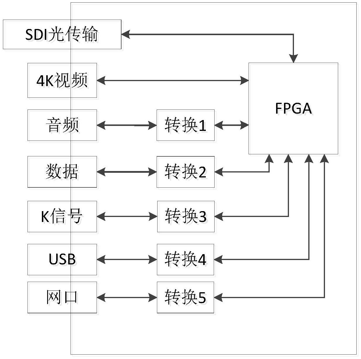 本实用新型提供一种4k视频远距离无损传输装置,包括FPGA模块、SDI光传输模块、视频模块、音频模块、数据信号传输模块、k信号模块、usb模块以及网络通信模块;所述SDI光传输模块、视频模块、音频模块、数据信号传输模块、k信号模块、usb模块以及网络通信模块均与FPGA模块连接;通过对各个模块进行设置通信与相应的处理,实现4KP60视频的远距离无损传输,同步实现音频和K信号发送与接收,以及数据、USB信号和网络信号的相互通信,满足实际场合的应用需求。