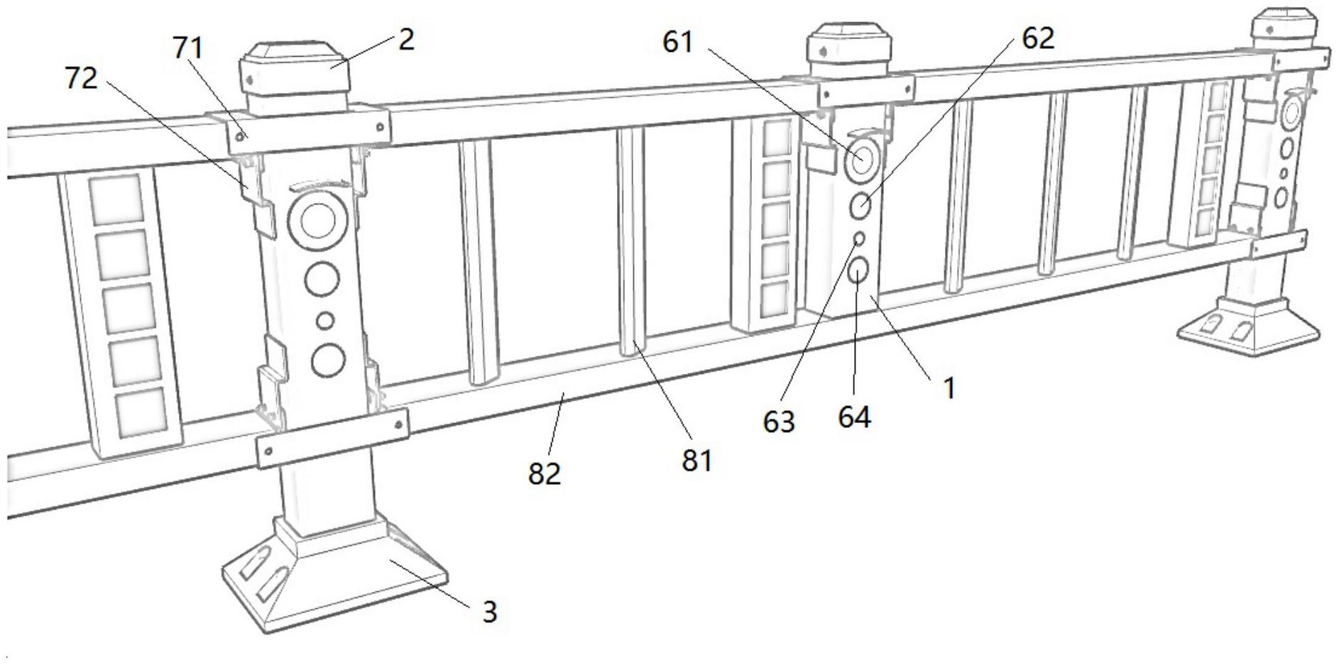 本实用新型公开了一种基于道路围栏的停车装置,包括围栏和视频桩,视频桩通过固定装置安装在围栏上,视频桩包括立柱、桩盖、底座、供电模块、通信模块、识别抓拍模块、雷达检测模块、辅助模块和停车计时模块,底座对桩体进行支撑,立柱、桩盖和底座构成视频桩桩体,供电模块、通信模块、识别抓拍模块、雷达检测模块和辅助模块安装在桩体,供电模块为通信模块、识别抓拍模块、雷达检测模块和辅助模块供电,本实用新型的视频桩可以完美结合道路围栏设计,实现智慧停车视频桩功能,又能美化城市,不至于造成道路障碍,使道路更加整洁美观,同时无需大面积破坏路面施工和预埋线路管道等繁琐操作,施工安装变得极为简单和便利。