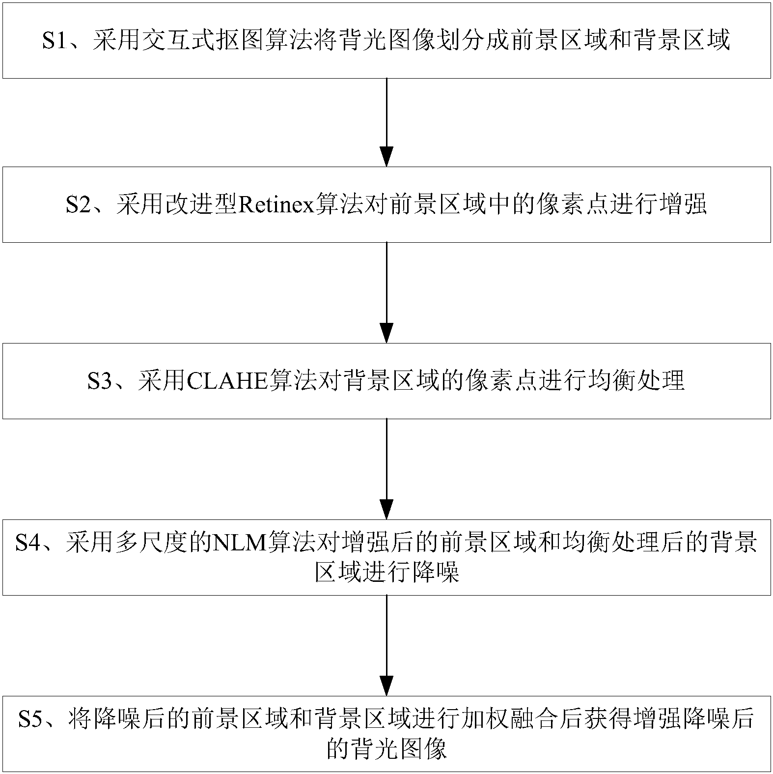 本发明公开了一种基于前景背景分离的背光图像增强去噪方法,包括:采用交互式抠图算法将背光图像划分成前景区域和背景区域;采用改进型Retinex算法对前景区域中的像素点进行增强;采用CLAHE算法对背景区域的像素点进行均衡处理;采用多尺度的NLM算法对增强后的前景区域和均衡处理后的背景区域进行降噪;将降噪后的前景区域和背景区域进行加权融合后获得增强降噪后的背光图像。本发明针对背光图像的前景区域和背景区域分别采用不同的增强和去噪方法,能够对背光图像的前景区域实现细节增强,同时保护背景区域不被过度增强,去噪效果好、准确度高,可广泛应用于背光图像的处理领域中。