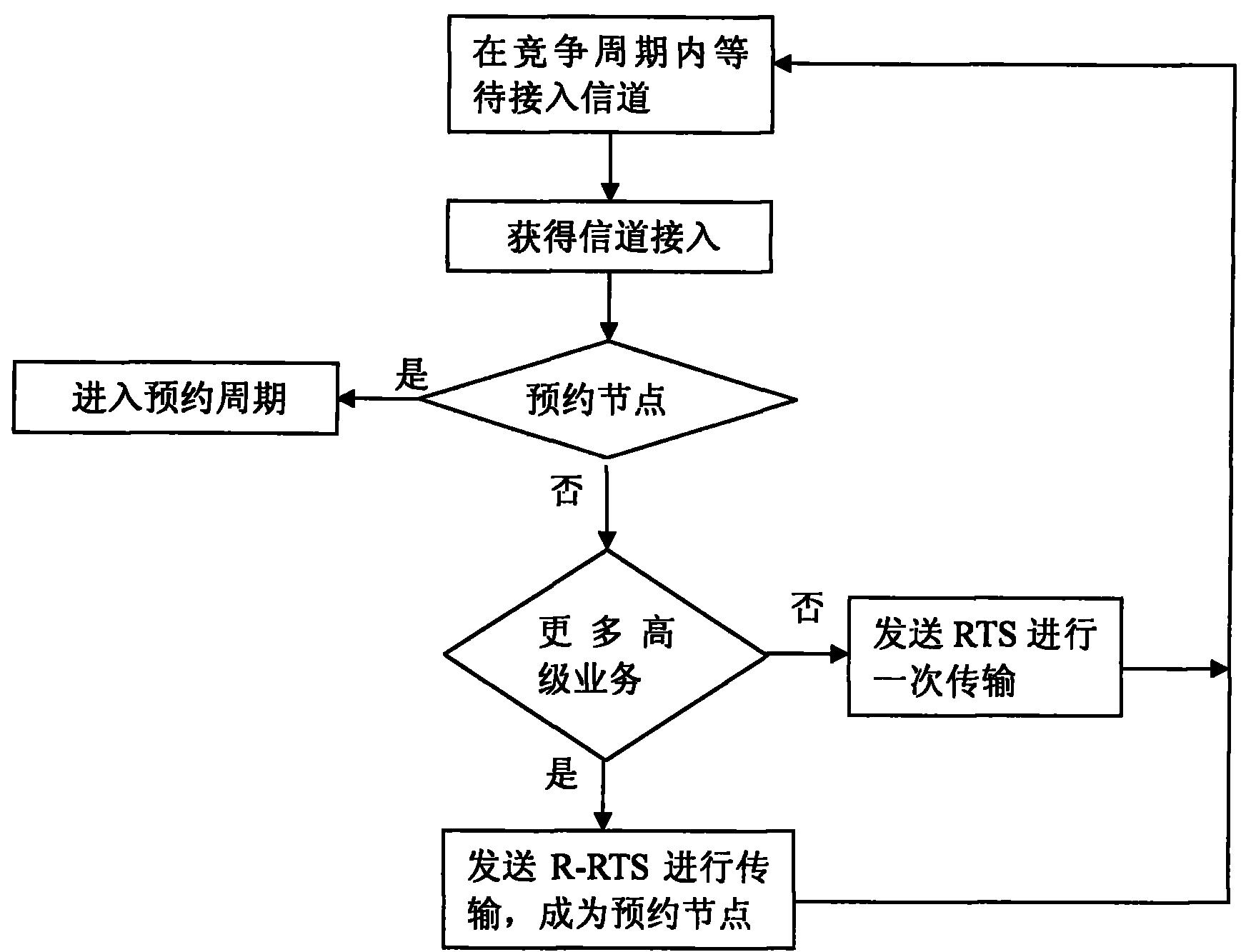 在网络中引入无竞争传输周期的分布式处理方法,适用于基于IEEE?802.11e协议的多跳网络(Ad?hoc网络)尤其是无线Mesh网络(Wireless?Mesh?Network)中的多媒体通信。本发明通过网络节点发送特定的R-RTS/A-RTS/AR-RTS帧来进行信道的预约通告以及无竞争传输顺序的通告。其中R-RTS是竞争周期内的预约帧,A-RTS和AR-RTS帧是预约无竞争周期内的指派帧和指派预约帧。每个节点会维护一个预约等待列表,保存预约节点的地址。在预约无竞争周期内各节点根据这个列表来以及A-RTS/AR-RTS指派帧的通告消息来维持顺序的无竞争传输。