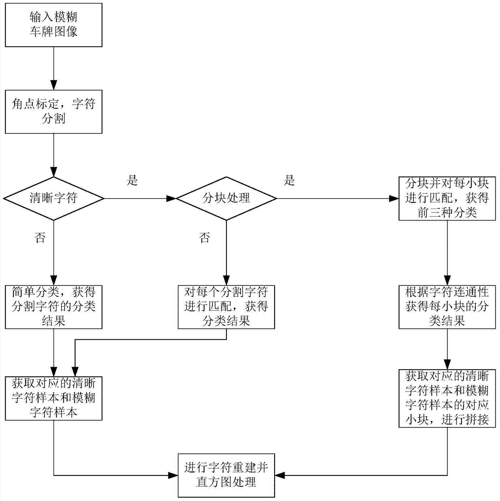 本发明公开了一种基于特征学习的模糊车牌重建方法,包括:获取覆盖所有车牌字符类型的大量清晰字符样本并获得其对应的模糊字符样本,建立模糊字符样本库并进行特征训练;获取模糊车牌图像并标定其后五位字符的四个角点,进行几何校正并进行字符分割,获得五个分割字符;获取每个分割字符对应的清晰字符样本和模糊字符样本;根据每个分割字符对应的清晰字符样本和模糊字符样本,对该分割字符进行字符重建后获得重建结果,并对重建结果进行直方图处理。本发明极大地提升了重建结果的可识别性,重建效果较好,可以较为清晰、准确地对车牌图像进行复原,可广泛应用于车牌号码识别领域中。