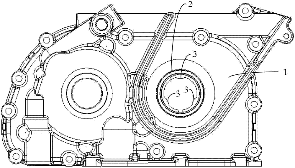 本实用新型提供一种机油泵壳体、机油泵、发动机及汽车,其中,机油泵壳体中部设置有中心孔,其中:所述中心孔的内壁上设置有数个向内凸起的凸缘,所述凸缘用于卡持曲轴。采用上述技术方案,可减少定位销孔的加工数量,降低加工成本,保证安装精度。