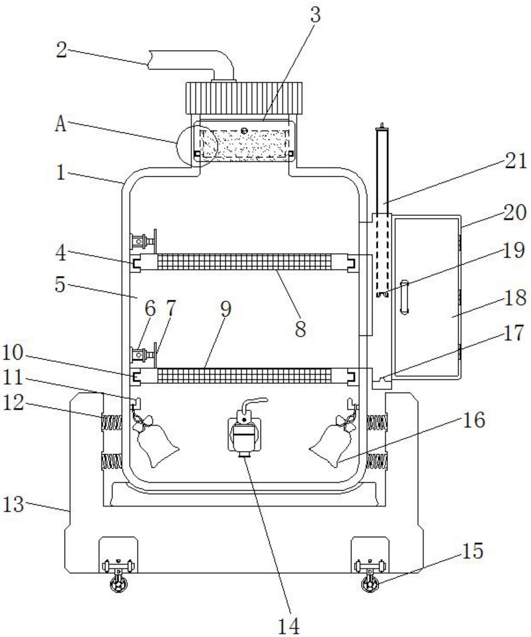 本实用新型公开了虫草酒过滤纯化装置,包括主体、推板、底座和外板,所述主体的顶端衔接有进料口,且进料口的下方安装有抽拉机构,所述推板安置于液压气缸的末端,且推板的右侧设置有杂质收集腔。该虫草酒过滤纯化装置设置有储放袋,储放袋的设计用来储放果壳活性炭,果壳活性炭有着良好的吸附能力和不错的脱色能力,孔隙发达,内部空间充裕,可以吸附各种杂质和有机物等,很好的将虫草酒中的杂质、色素和有机物吸附吸附,提高酒水的纯度,改善水质口感,且果壳活性炭价格实惠,吸附效果还不错,真正做到了物美价廉,同时,第一过滤板的网孔直径大于第二过滤板的网孔直径,该设计实现了对虫草酒的多次过滤,进一步提高了装置的纯化效果。
