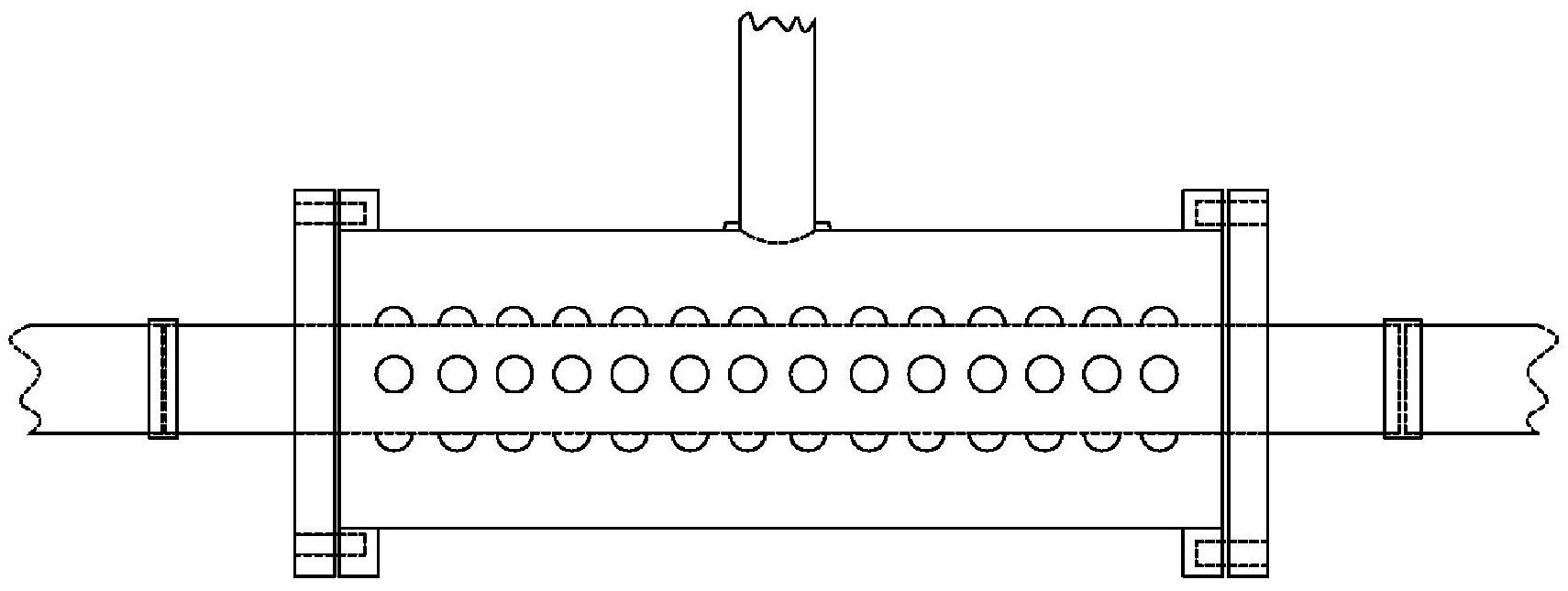 本实用新型涉及连续灭菌设备领域,具体涉及一种发酵连消系统汽水混合灭菌器。包括发酵液进口、灭菌器盖板、灭菌器外套管、灭菌器芯管、蒸汽进气管、发酵液出口、维持管,其特征在于:所述的灭菌器芯管两端分别连接有发酵液进口和发酵液出口;所述的灭菌器芯管壁上设置有若干细孔;所述的灭菌器芯管外包围设置有灭菌器外套管,灭菌器外套管与灭菌器芯管之间形成腔室;所述的灭菌器外套管两端设置有灭菌器盖板;所述的灭菌器外套管上设置有蒸汽进气管,所述的蒸汽进气管与灭菌器外套管连通。蒸汽热能损失小,灭菌时间短,有效节约蒸汽,物料营养成分损失小,且染菌风险小,稳定性高,有利于生产的安全稳定进行。