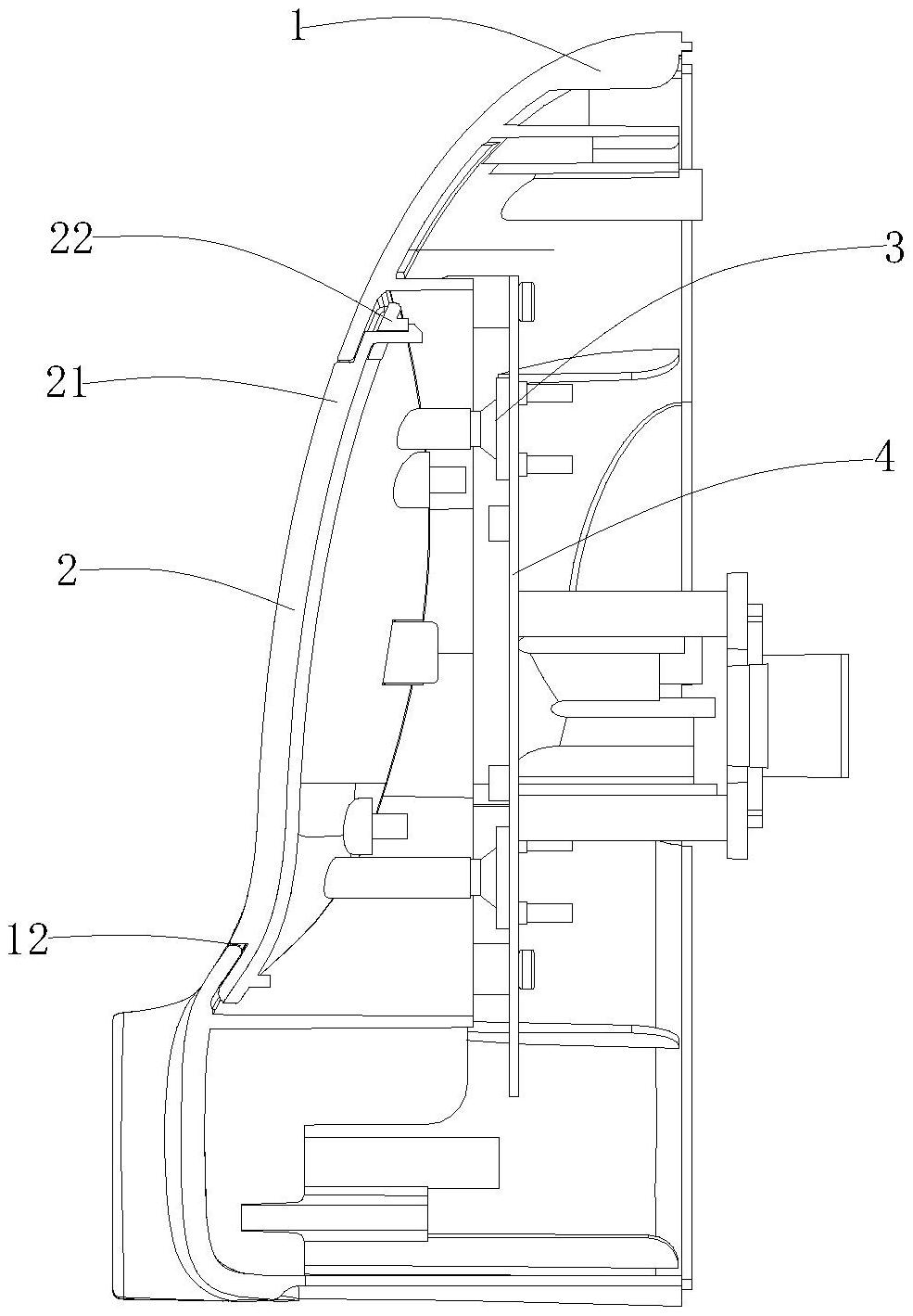 本实用新型公开了一种电子产品的鼓点按键结构,涉及技术领域电子产品,包括具有容置腔的前壳空心主体;还包括从内向外依次设置在容置腔内的鼓点按键、复位件和控制板;所述控制板与前壳主体相连接,所述复位件连接于所述鼓点按键和所述控制板之间,所述前壳空心主体具有按压鼓点按键的按压部;所述鼓点按键包括可拆装连接在一起的按键镜片和按键衬件。本实用新型避免了对类似键盘的按键敲击声响感到不适,同时兼顾了喜欢类似键盘的按键敲击声响的消费者,使该电子产品受众更广泛,适应性更强,按键镜片在保证与前壳空心主体连接后的整体性的情况下,按键衬件保证按键镜片的稳定性,使该前壳空心主体组装后美观且可靠性强。