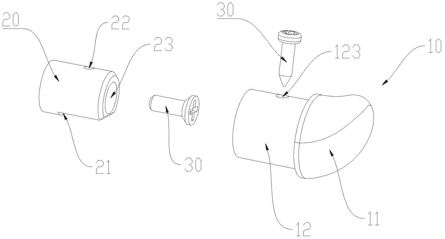 本实用新型涉及旋钮结构技术领域,尤其是指一种旋钮组件及开关结构,该旋钮组件,包括:手柄部及与所述手柄部连接的衬件;所述手柄部的前端设有空腔,所述空腔内设有限位凸起,所述衬件的后端套设于所述空腔内,所述衬件的底部设有对应于所述限位凸起的凹槽,所述凹槽与所述限位凸起配合连接。本实用新型结构牢固紧凑,力传递效率高,稳定性好,拆卸方便,实用性强。