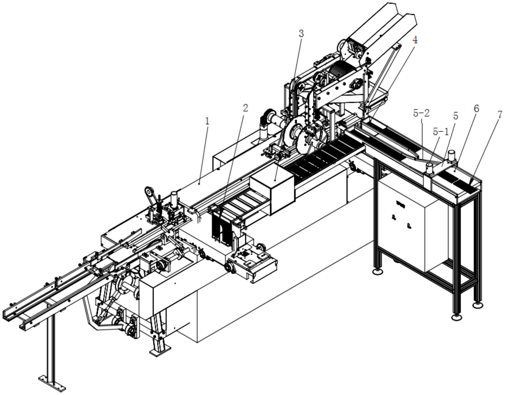 本实用新型涉及铅笔生产技术领域,具体地说是一种连接铅笔刨槽机与胶芯机的分板装置。一种连接铅笔刨槽机与胶芯机的分板装置,包括胶芯机、翻转机构、左料仓、右料仓、刨槽机,其特征在于:位于刨槽机的出口处设有分板装置的一端,分板装置的另一端连接Y向输送装置的一端,Y向输送装置的另一端连接右料仓;位于Y向输送装置的左侧连接X向输送装置的一端,X向输送装置的另一端连接左料仓;所述的X向输送装置上设有翻转机构;位于X向输送装置的后方设有胶芯机。同现有技术相比,提供一种连接铅笔刨槽机与胶芯机的分板装置,结构简单,成本低廉,调整方便,更好的融入设备,最终达到每分钟200片的功能,减少人工,提高效率。