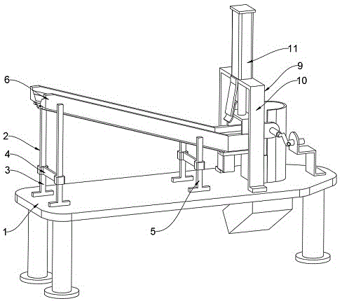 本实用新型公开了一种禽流感疫苗生产用疫苗自动收获装置,包括底部支撑架,所述底部支撑架的上端面安装有蛋体导向支撑机构,所述蛋体导向支撑机构包括第一支撑腿、锁紧架、第二支撑腿、导向侧板、托板和限位条,所述托板的外侧安装有两个限位条,所述限位条的上端面安装有导向侧板,其中一个所述导向侧板一端的外侧安装有第一支撑腿,所述导向侧板另一端的外侧安装有第二支撑腿,所述第一支撑腿与第二支撑腿的外侧均安装有锁紧架,所述蛋体导向支撑机构的一端安装有移动收取机构。本实用新型通过对蛋体进行移动和疫苗的收获,提高生产效率,能够对蛋体进行清洁和统一处理,提高生产环境。