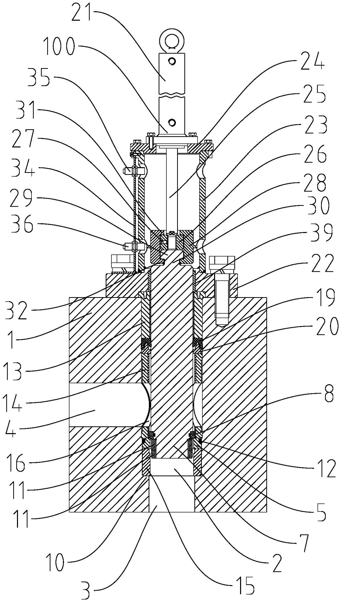 本实用新型公开了一种水压机用注水阀,它包括阀体、阀座、柱塞、阀芯和驱动机构;其中,所述阀体中设有阀通道、进水口以及出水口;所述阀座安装在所述阀通道中,所述阀座的外壁与所述阀通道的内壁密封连接,所述阀座的内侧设有连接通道,所述阀座位于所述进水口和所述出水口之间;所述柱塞直接或间接地滑动连接在所述阀通道中并在滑动过程中具有关闭位置和打开位置;所述阀芯连接在所述柱塞上,所述阀芯用于在所述柱塞滑动至所述关闭位置时与所述阀座密封抵接以封堵住所述连接通道;所述驱动机构与所述柱塞相连并用于驱动所述柱塞滑动。本实用新型能够避免频繁更换密封圈,能够避免因密封圈磨损和老化而引起的泄漏问题,使用更加方便。