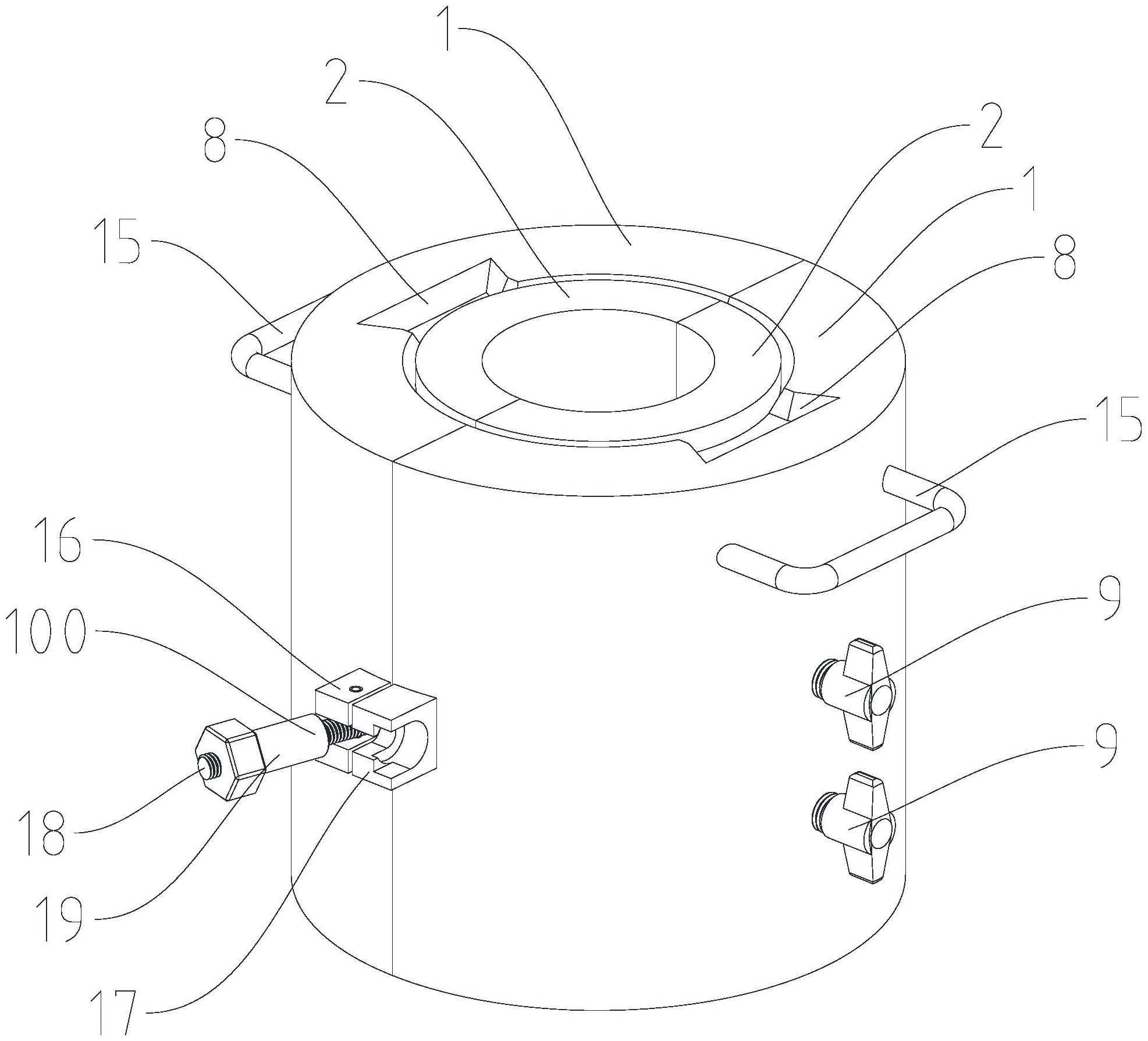 本实用新型公开了一种套管用对扣器,它包括两个套体、与所述套体对应的内衬以及锁紧机构;其中,两个所述套体的一端部相互铰接,两个所述套体在转动过程中具有打开状态和闭合状态;所述内衬可拆卸地连接在对应的所述套体上,当两个所述套体转动至闭合状态时两个所述套体上的内衬相互合拢并用于抱住套管;所述锁紧机构分别与两个所述套体相连,所述锁紧机构用于当两个所述套体转动至闭合状态时将两个所述套体的另一端部锁紧连接。本实用新型能够将套管对扣连接,能够适用于多种尺寸规格的套管的连接,使用更加灵活方便。