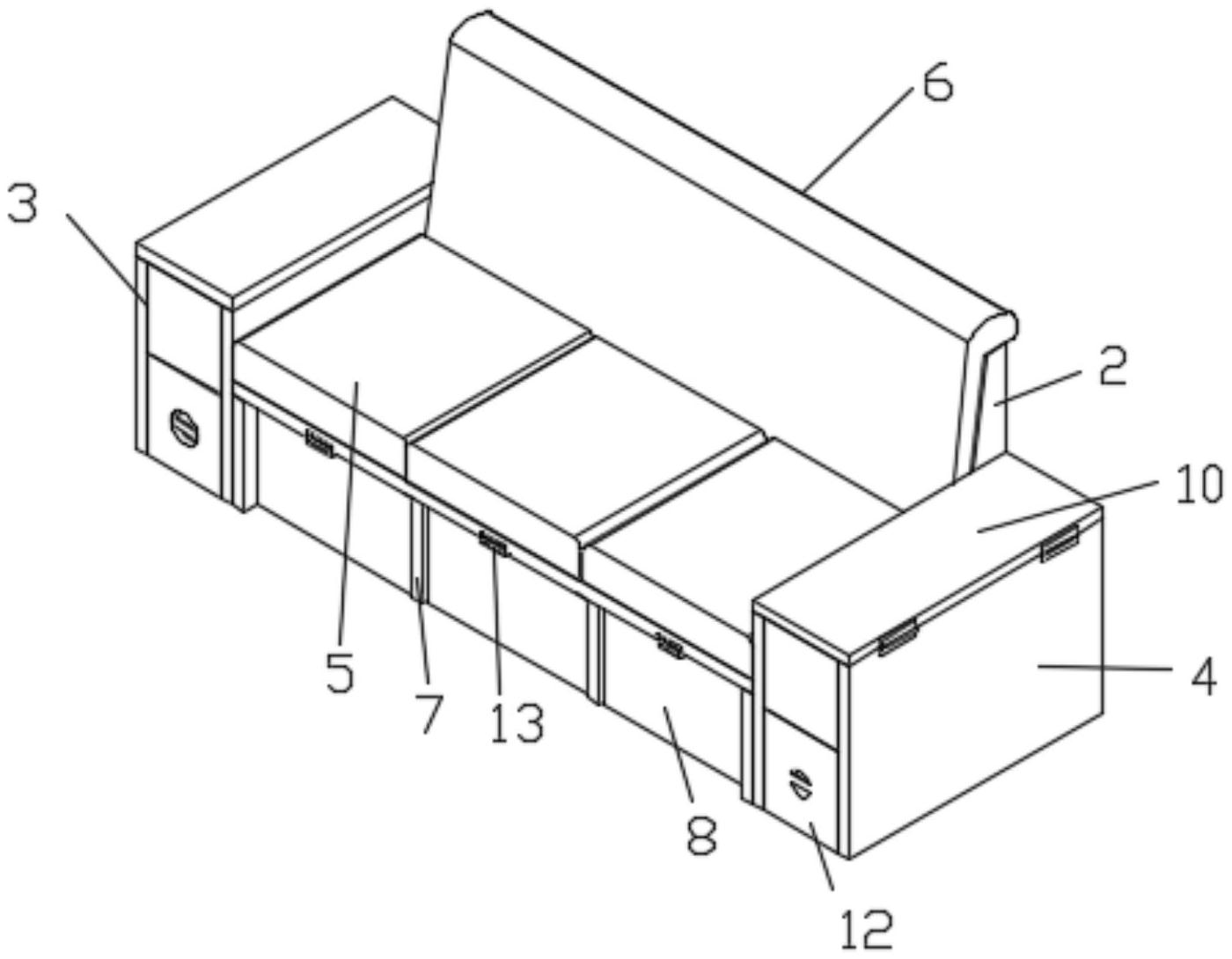 本实用新型涉及一种收纳式沙发,包括沙发底座、靠背、左扶手和右扶手,所述沙发底座与靠背固定连接,所述左扶手和右扶手固定安装在沙发底座的左侧和右侧,所述沙发底座上放置有沙发垫,所述靠背上安装有靠背垫;所述沙发底座的下端设置有容纳槽,所述容纳槽内间隔固定安装有隔板,所述隔板的外端位于沙发底座的内侧,所述隔板将容纳槽分隔为容纳空间,所述容纳空间内放置有容纳箱,所述容纳箱放置在容纳槽内且所述容纳箱的外端位于沙发底座的内侧,所述左扶手和右扶手的上部设置有凹槽,所述凹槽的上端通过合页铰接有盖板,所述左扶手和右扶手的下部设置有滑槽,所述滑槽内放置有侧箱。本实用新型具有结构简单,收纳性强,舒适度高的优点。
