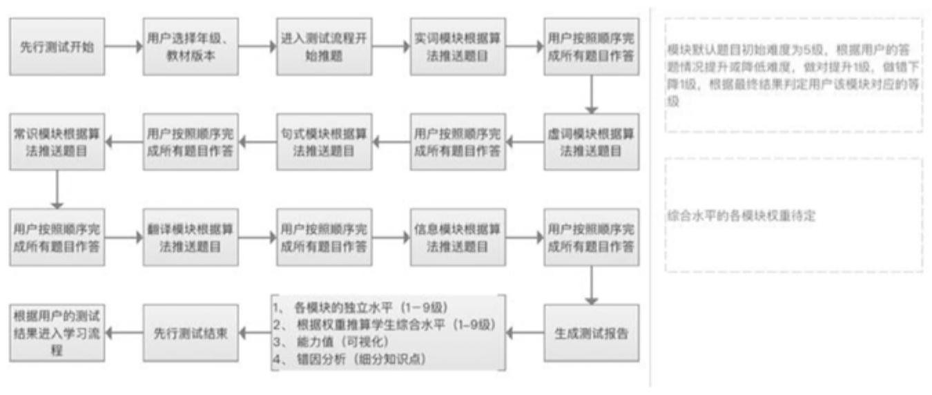 本发明涉及一种中文自动分级方法,包括以下步骤:步骤1.系统对每个知识点进行9个等级的划分;步骤2.用户根据自己的年级和学习版本进行选择;步骤3.然后由系统的算法引擎给用户推送题目(每个题目分为9个等级);步骤4.通过每个知识点的测试最终得出用户的每个知识点的等级;步骤5.生成报告;步骤6.根据用户测试的报告不同,推送给每个用户不同的学习路径进行学习。与现有技术相比,本发明具有以下优点:可以精确的了解到用户目前的薄弱知识点及之前的的薄弱知识点。
