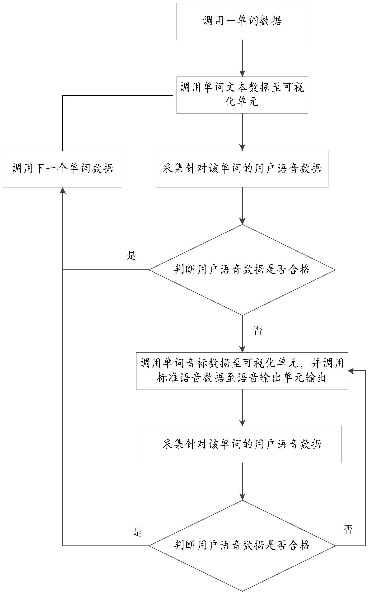 本发明公开了单词语音训练系统,包括数据采集模块、数据处理模块和数据输出模块;所述数据采集模块用于采集用户语音数据;数据处理模块用于判断用户语音数据是否合格;数据输出模块用于输出标准语音数据。本发明其能够对用户的语音进行评测,并在用户语音不准确时,发出标准语音供用户学习。