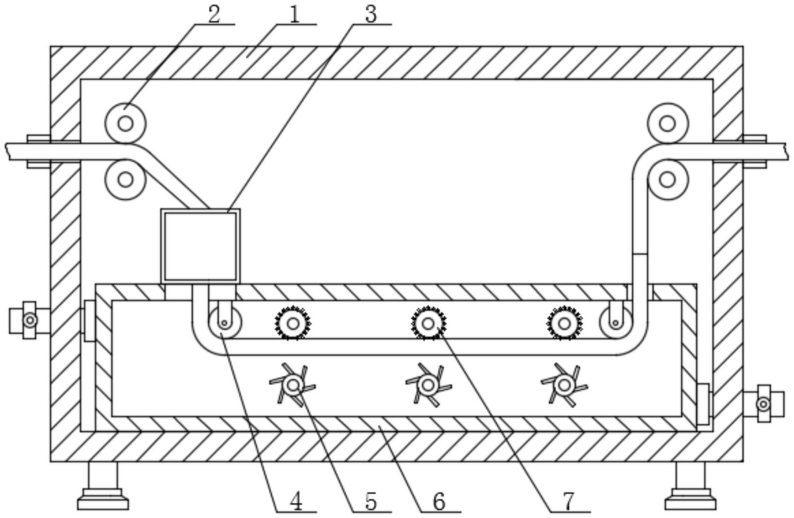 本实用新型公开了一种家纺纤维面料的湿态汽蒸高效连续染色装置,涉及纺织设备技术领域,包括箱体和设置在箱体内顶部两端的两组输送辊,箱体内顶面设有染色箱,染色箱顶部一侧设有用于纤维布中染料初步去除的除染料机构,染色箱内顶部等间距转动设有多个刷辊,多个刷辊下方等间距转动设有多个用于搅拌染料的搅拌件,箱体后端面底部设有用于搅拌件转动的连接机构;本实用新型通过除染料机构的使用,便于去除然染色后的纤维面料中含有的染色剂,避免染色剂滴落在染色装置的出布口,从而避免周围环境被染色剂污染,有利于对周围环境的保护。