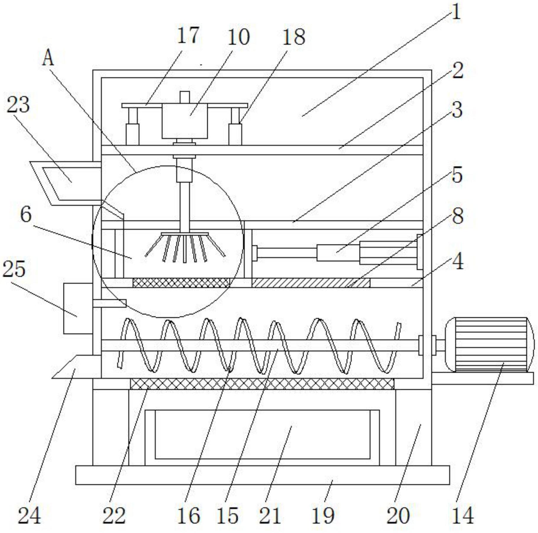 本实用新型公开了一种快速软化的润药设备,包括底板和箱体,箱体的内部固定安装有第一隔板、第二隔板和第三隔板,箱体的内部且位于第二隔板和第三隔板至今固定安装有第一伸缩气缸,第一伸缩气缸的输出端固定安装有润药框,润药框的顶部与第二隔板的底部滑动连接,第三隔板的底部开设有充气网和下料槽,第二隔板的内部与充气网对应的位置开设有搅拌槽,第一隔板设置有第一转动电机,第一转动电机通过升降装置与第一隔板的顶部固定连接。本实用新型通过设置了润药框和蒸汽发生器等元件,使药片可以湿润,且降低含水量,防止有效成分流失,并通过移动润药框,在通过旋转板将原料运出可实现快速的下料,方便操作,节省人力物力。