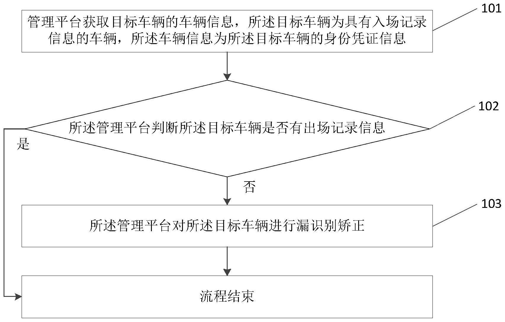 本申请实施例公开了一种车辆管理方法、系统、设备及相关存储介质,能够有效的解决车辆出场漏识别问题,方便对车辆的入场和出场进行管理。本申请包括:获取目标车辆的车辆信息,所述目标车辆为具有入场记录信息的车辆,所述车辆信息为所述目标车辆的身份凭证信息;判断所述目标车辆是否有出场记录信息;若否,则对所述目标车辆进行漏识别矫正。