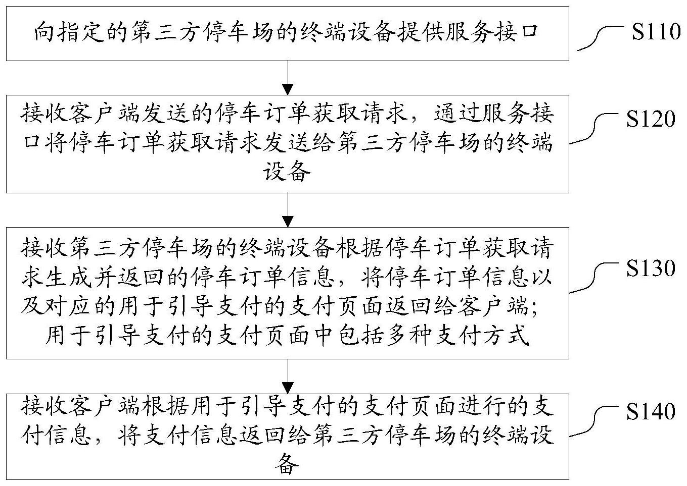 本发明公开了一种停车场管理方法、装置、电子设备和计算机可读存储介质。该方法包括:向指定的第三方停车场的终端设备提供服务接口;接收客户端发送的停车订单获取请求,通过服务接口将停车订单获取请求发送给第三方停车场的终端设备;接收第三方停车场的终端设备根据停车订单获取请求生成并返回的停车订单信息,将停车订单信息以及对应的用于引导支付的支付页面返回给客户端;用于引导支付的支付页面中包括多种支付方式;接收客户端根据用于引导支付的支付页面进行的支付信息,将支付信息返回给第三方停车场的终端设备。本技术方案可以使得第三方停车场可以通过该服务接口实现多种支付方式,满足用户的支付需求,防止用户流失。
