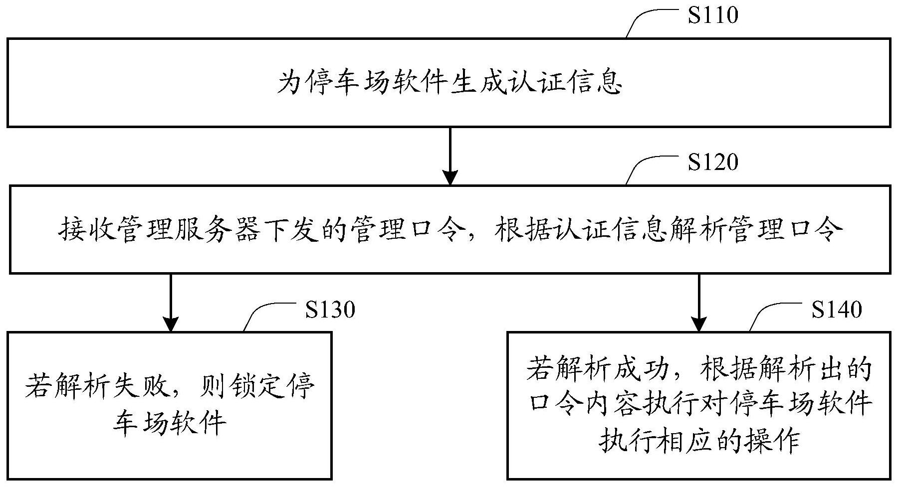 本发明公开了停车场软件的管理方法、装置和系统。所述方法包括:为所述停车场软件生成认证信息;接收管理服务器下发的管理口令,根据所述认证信息解析所述管理口令;若解析失败,则锁定所述停车场软件;若解析成功,根据解析出的口令内容执行对所述停车场软件执行相应的操作。该技术方案以软件方式确保停车场软件的合规使用,在停车场软件被违规操作后,认证信息被更改,管理口令不能正确解析,可以锁定停车场软件以免造成更大的损失,操作简单,安全性好,相较于硬件保护无遗失风险,实现了停车场软件的合理管理和保护。