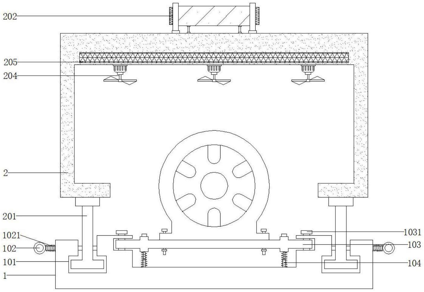 本实用新型公开了一种电机运行冷却防尘罩,属于电机技术领域,包括底座、卡槽、防尘罩和支撑板,底座上方通过两侧嵌入设置的卡槽与防尘罩下方两侧固定安装的支撑板卡接设置,底座上设置有减震结构,防尘罩上设置有冷却结构,减震结构包括紧固螺杆、弹簧、固定板、螺栓和减震器,底座与固定板连接处通过转动设置的紧固螺杆配套设置有弹簧。本实用新型中,将防尘罩下方两侧的支撑板卡接在底座上方的卡槽中,且使用螺栓从底座与固定板中穿过,将固定板固定在底座上,且因弹簧收缩后向两侧产生弹力,从而使紧固螺杆与底座连接处呈紧绷状态,有效的将防尘罩与底座连接。