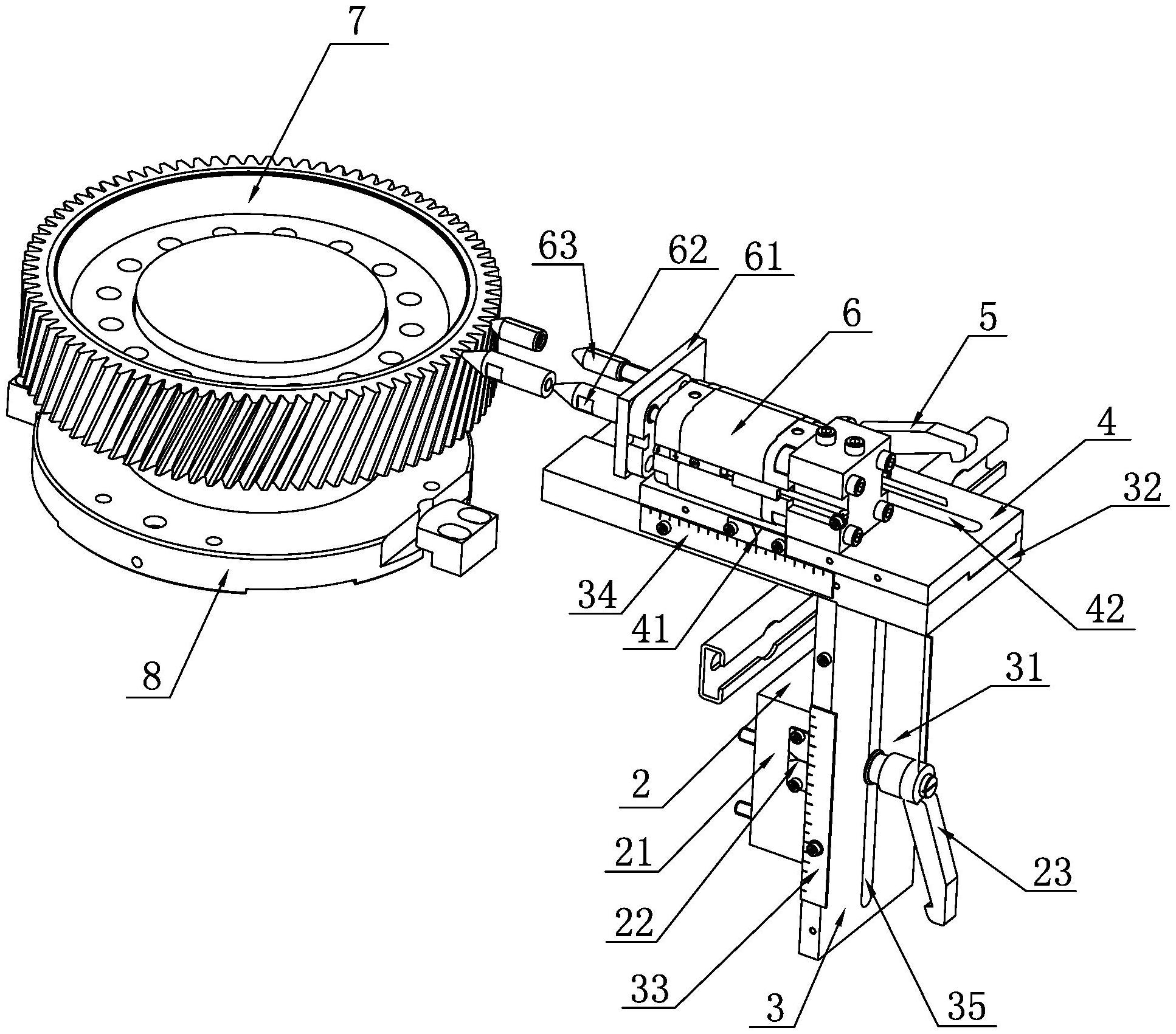 本实用新型公开了一种齿轮周向精准定位自动拨转装置。它能对随输送过的待加工齿轮进行周向精准微调定位,确保在进行机械加工或装配前实现对齿轮的周向精准定位。待校正齿轮和齿轮座结合体随输送线送在输送过程中因各种原因会导致待校正齿轮在齿轮座上周向位置会产生微小变动,在加工或机械化装配前必须进行周向精准定位,否则会导致齿轮加报废或装配错误,只要启动直线气缸,使第一顶针和第二顶针同步伸展,第二顶针会顶拨待校正齿轮进行周向微量转动,使第一顶针插入待校正齿轮的对应齿槽中实现周向的精准定位。保证了待校正齿轮在所加工工位或装配时的周向精准定位。